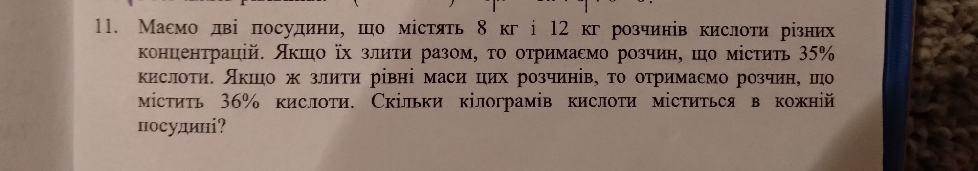 Теперь подсчитаем, сколько % кислоты содержится в смеси растворов, если растворы изначально весили равное число кг, и приравняем полученное выражение числу 36 из условия. Так как в условии говорится о равном количестве кг, то можем брать любое количество кг. Возьмём, например, 8 кг (можно взять 12 кг, или 100 кг, ...).