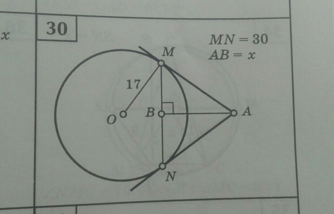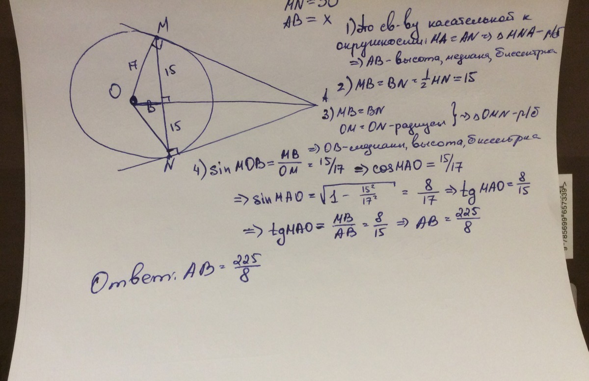 Проведём ОВ и получим прямоугольный треугольник МОВ, у которого ОМ = 17, МВ = 0,5МN = 15, отсюда ОВ = 8 (17, 15, 8 - Пифагорова тройка). Треугольник ОМА - прямоугольный (угол ОМА = 90 градусов, ОМ и МА перпендикулярны как радиус и касательная) МВ - его высота. Воспользовавшись свойством высоты прямоугольного треугольника, опущенной на гипотенузу, имеем МВ² = ОВ · ВА; ВА = МВ² : ОВ = 225 : 8 = 28,125