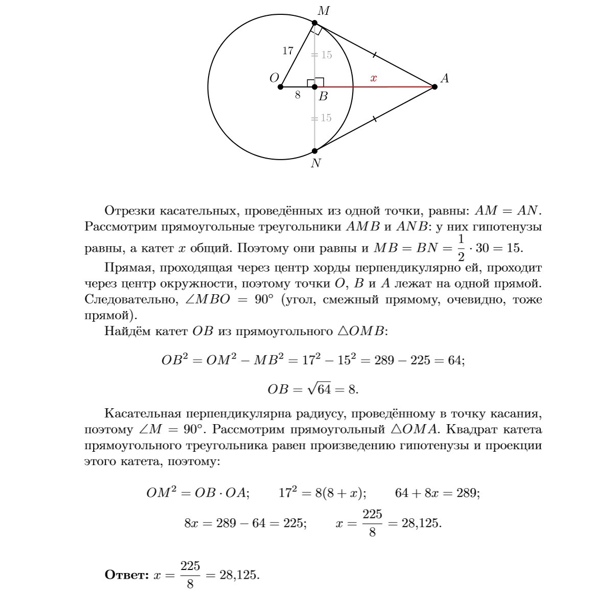 Поскольку окружность вписана в угол MAN, то её центр (О) принадлежит биссектрисе, АО, угла MAN. МА = AN (как отрезки кассателных, проведённых к окружности из одной точки), отсюда ΔAMN - равнобедренный, ВА - его высота, медиана и биссектриса (В - средина MN). Рассмотрим прямоугольный треугольник МОВ, у которого ОМ = 17, МВ = 0,5МN = 15, отсюда ОВ = 8 (17, 15, 8 - Пифагорова тройка). Треугольник ОМА - прямоугольный (угол ОМА = 90 градусов, ОМ и МА перпендикулярны как радиус и касcательная) МВ - его высота. Воспользовавшись свойством высоты прямоугольного треугольника, опущенной на гипотенузу, имеем МВ² = ОВ · ВА; ВА = МВ² : ОВ = 225 : 8 = 28,125.