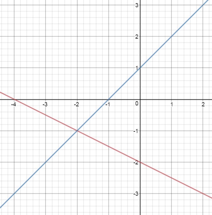 Всего-то требуется построить графики функций y=-1/2x-2 и y=x+1. Оба графика представляют собой прямую. Для построения достаточно определить две точки, через которые проходит прямая.