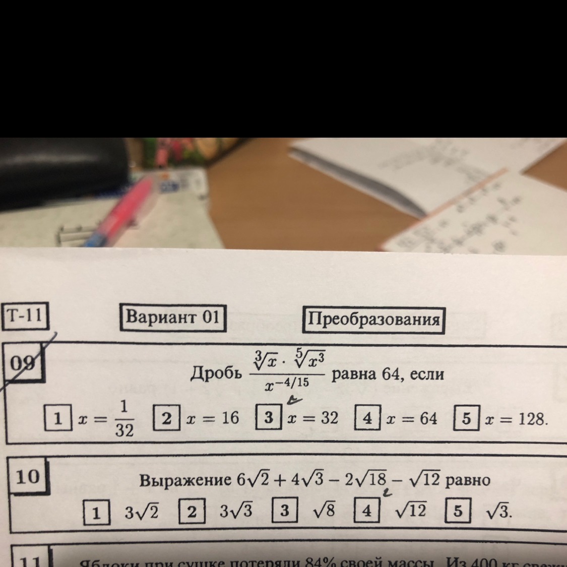 frac{sqrt[3]{x}, cdot , sqrt[5]{x^3}}{x^{-4/15}}=frac{x^{1/3}, cdot x^{3/5}}{x^{-4/15}}=frac{x^{1/3+3/5}}{x^{-4/15}}=frac{x^{14/15}}{x^{-4/15}}=x^{frac{14}{15}+frac{4}{15}}=x^{frac{18}{15}}=\\=x^{frac{6}{5}}=64; ; ; Rightarrow \\(x^{frac{6}{5}})^{frac{5}{6}}=64^{frac{5}{6}}\\x=(2^{6})^{frac{5}{6}}\\x=2^{5}\\x=32\\Otvet:; ; N^circ =3.