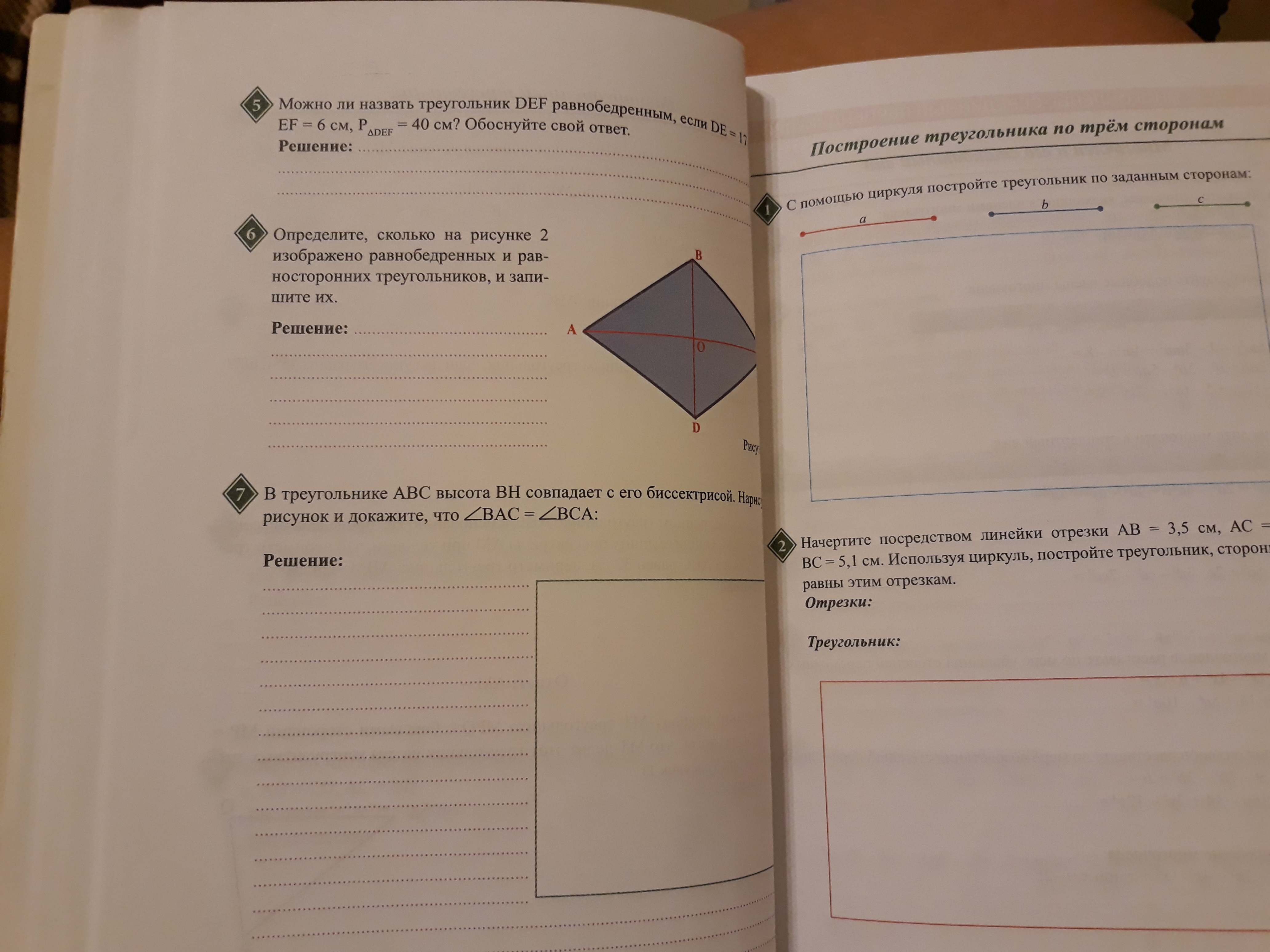 7 Треугольники ABH и CBH равны по стороне (BH) и двум прилежащим углам. - > AB=CB - > треугольник ABC равнобедренный - > значит <BAC =<BCA, нарисовать нужно вот такой треугольник https://5terka.com/images/geom79atanasyan/geom7atanasyan-266.png, поменять точку D на H и убрать цифры 1 2 3 4, остальное можно оставить