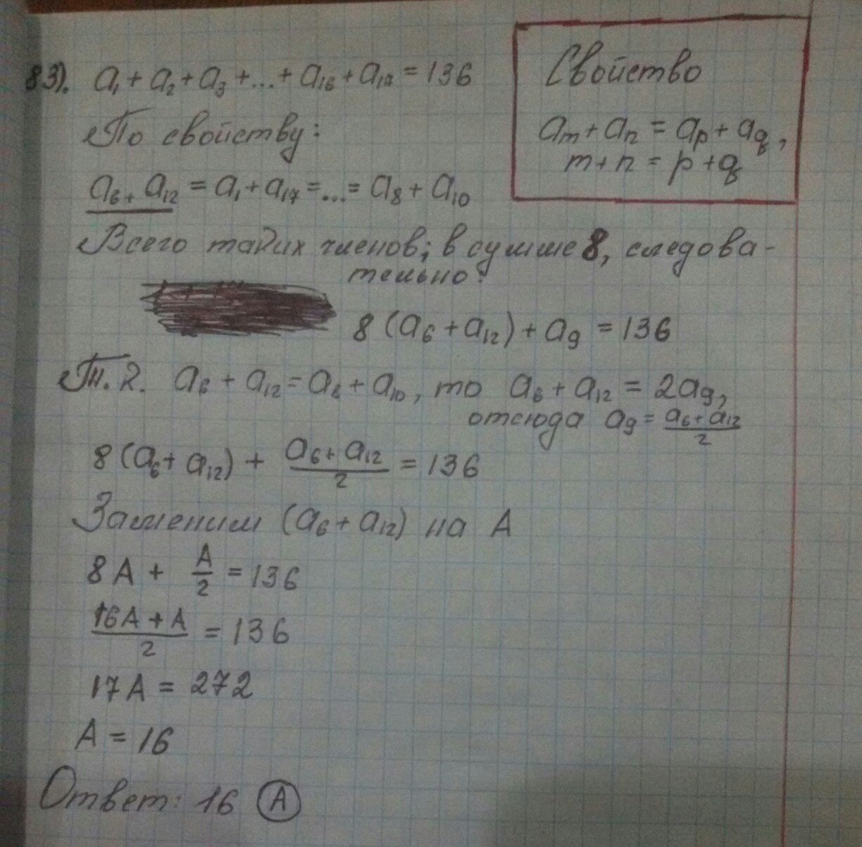 83) проще решается через формулу суммы S17... a1+a17 = 136*2/17 = 16 = 2a1+16d = a1+5d + a1+11d (ничего, кроме двух основных формул для прогрессии...)