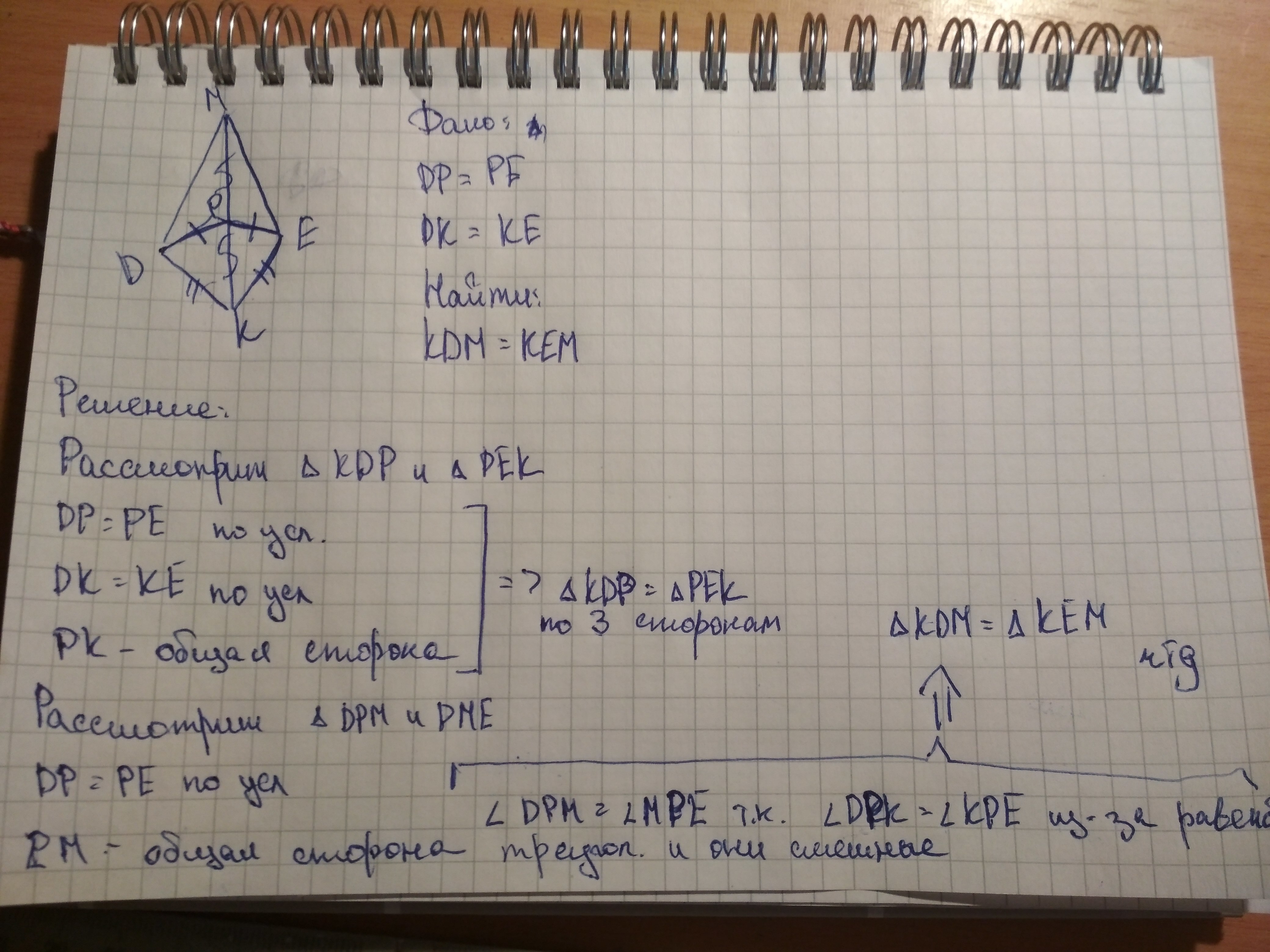 Помогите, пожалуйста! На рисунке (во вложении) 2 DP = PE, DK = KE. Докажите равенcтво углов KDM и KEM.