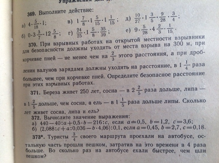 371) Дано: береза, сосна, липа ель, нужно найти сколько лет живет каждое дерево, опираясь на данные из условия. На самом деле всё это можно представить в виде переменных, пусть береза будет Б, сосна тогда С, липа будет Л, ну и ель это Е. Известно что береза живет 250 лет, знаем что Б равно 250. С тогда равно 250*12/5 = 600 лет. Л в 7/5 раз больше С, следовательно Л = 600*7/5 = 840 лет. Ну и напоследок Е равно 840*6/5 = 1008 лет. Ответ: сосна живет 600 лет, липа 840 лет, ель 1008 лет.