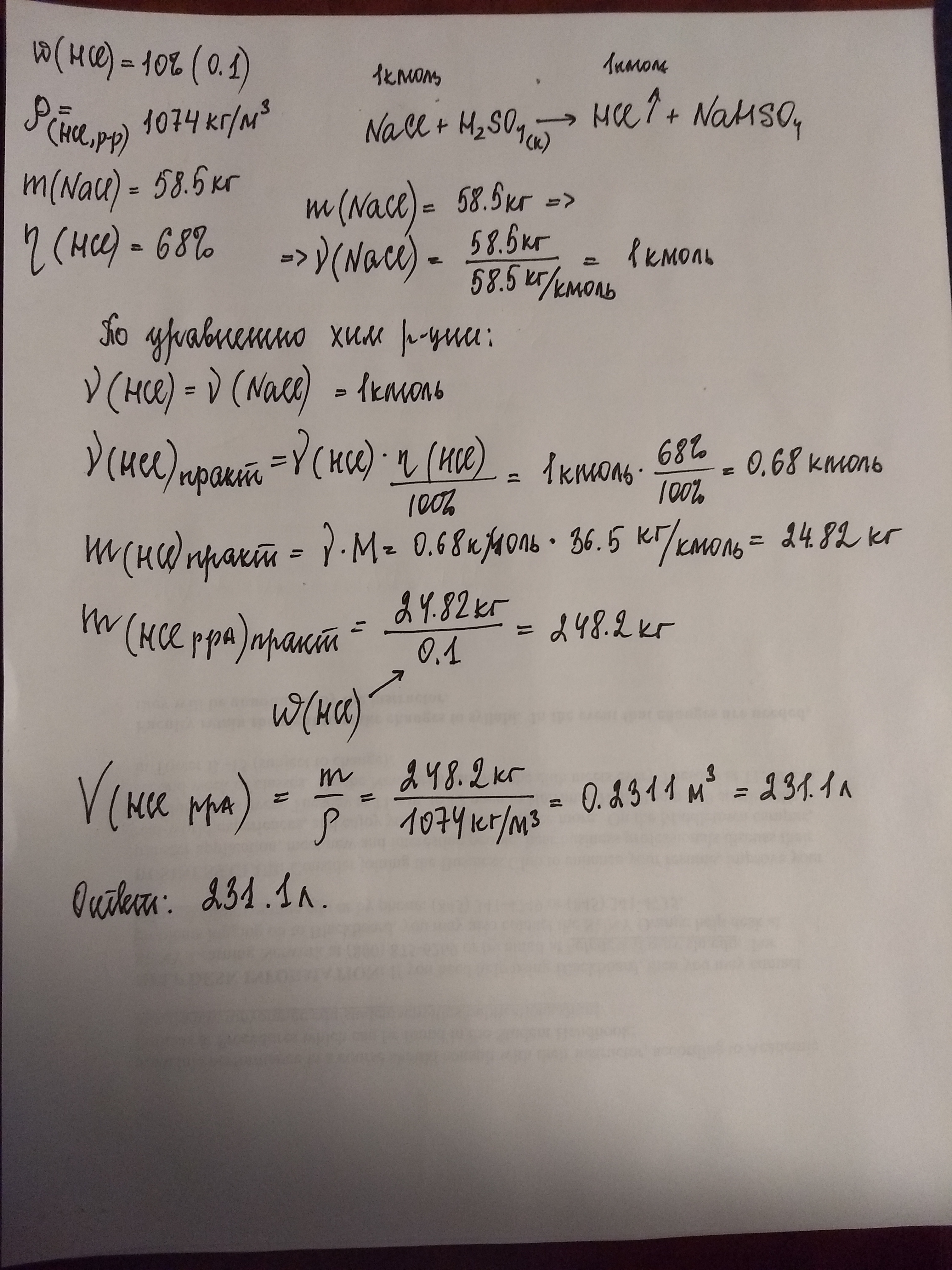 Ловите решение. Находим моли хлорида натрия, по ним моли HCl, учитываем выход. Далее по формуле массовой доли находим массу растврра, превращаем его в объем. Удачи!