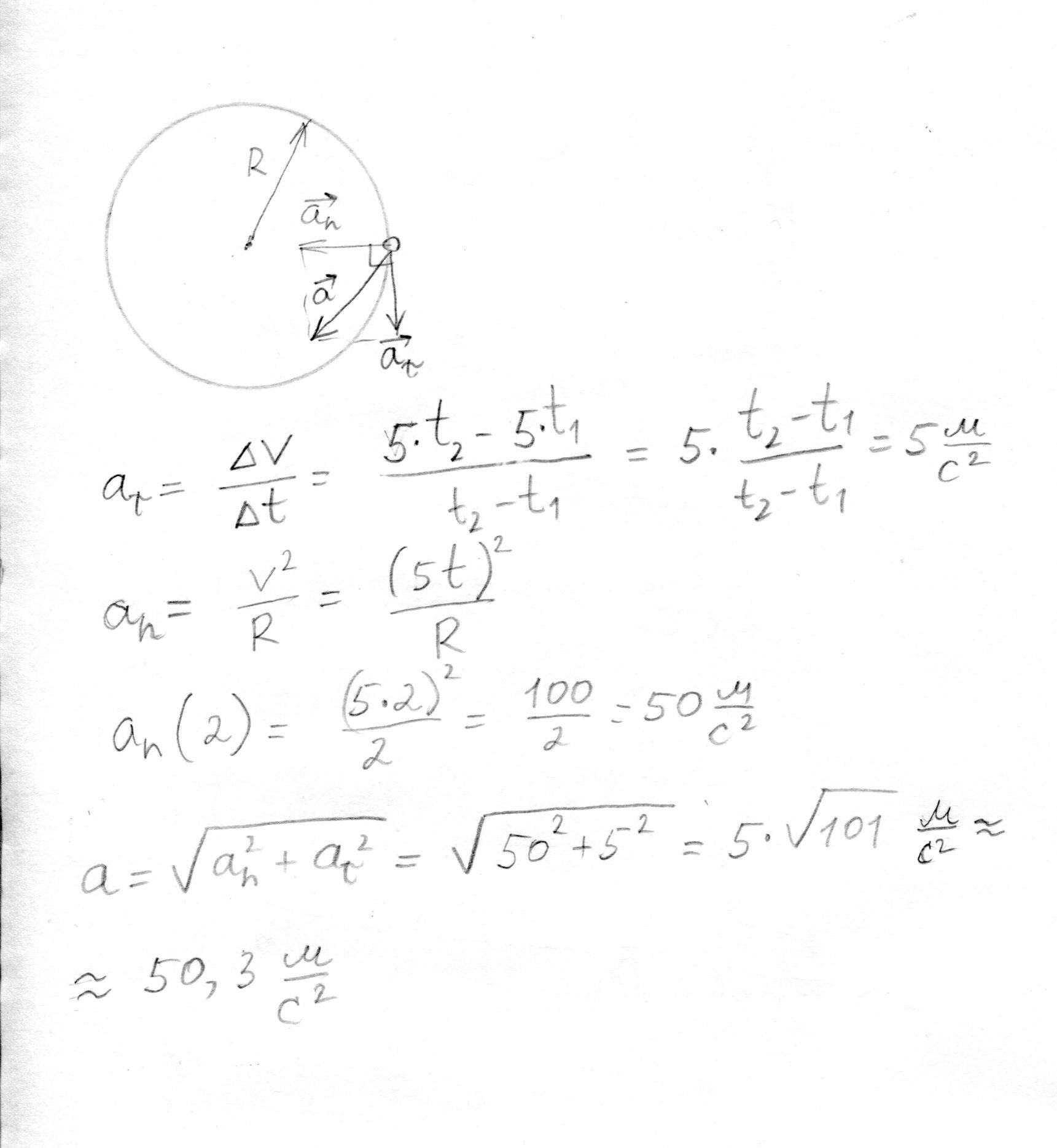 Точка движется по окружности радиуса 2(м) со скоростью V=5*t (м/с). Найти ускорение точки при t1=2 (с).