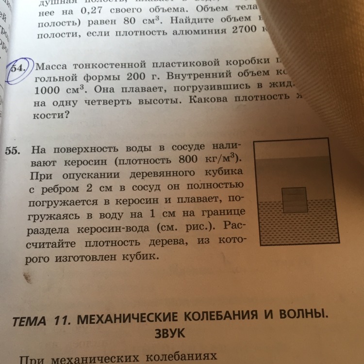 На поверхности воды в сосуде нулевая керосине плотность 800 кг делённое на метр кубический при опускании деревянную кубиков с ребром 2 см в сосуд он полностью рвётся в керосин и плавает погружаюсь в воду на один см на границе раздела керосина – вода