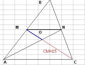 2 . Точки M и N являются серединами сторон AB и BC треугольника ABC соответственно . Отрезки AN и CM пересекаются в точке О , CM = 15 . Найдите МО.