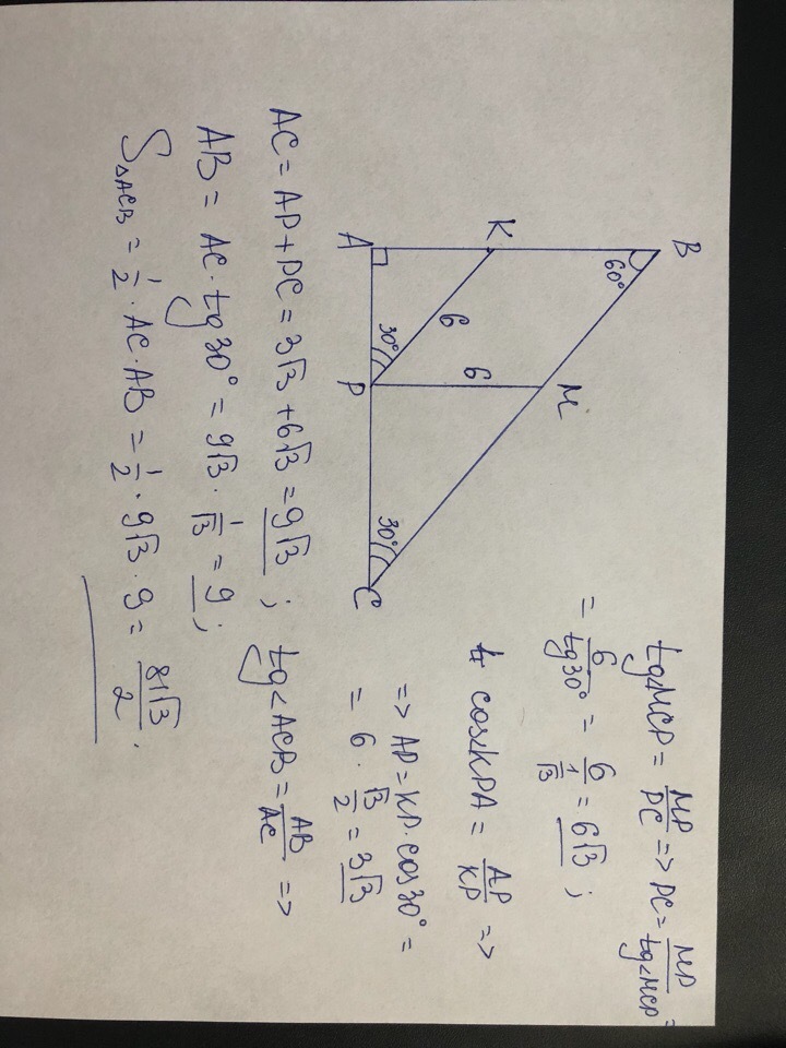 Рассмотрим треугольник KAP. Очевидно, что ∠KPA = ∠MCP = 30° как соответственные углы, образованные при пересечении параллельных прямых MC и KP секущей AC. Используя определение косинуса угла, получаем: AP = 3√3.