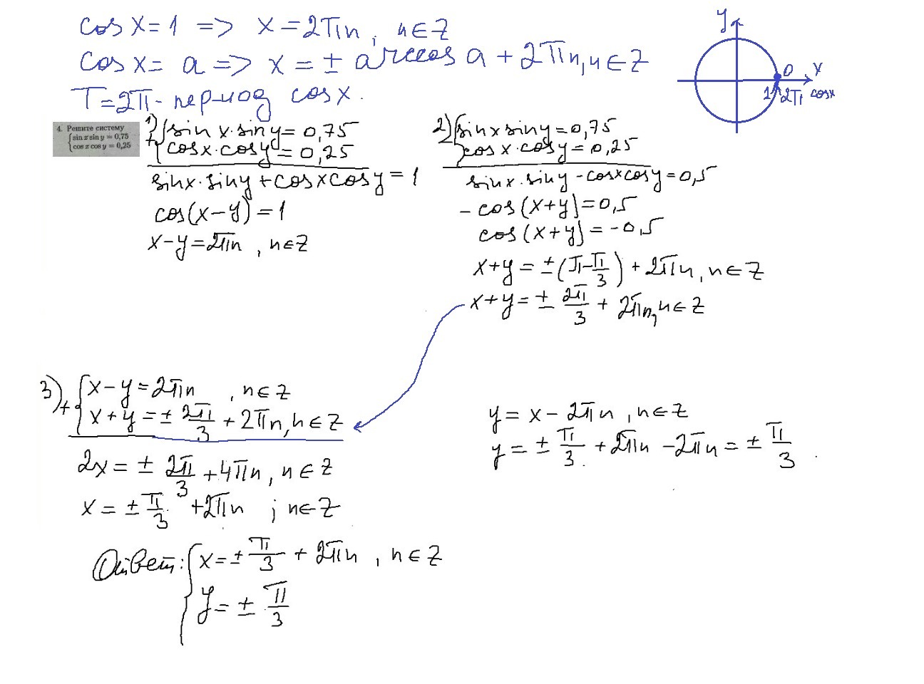 А в первом действии я не понимаю почему получилось х-у=2пn, я правда не знаю, объясните. Смотрите х-у=arccos(1), это ноль, ну то есть 2п, а почему там еще на n домножено, почему мы не записываем как 2п+2пn, это вот косинус и к нему всегда 2пn прибавляем