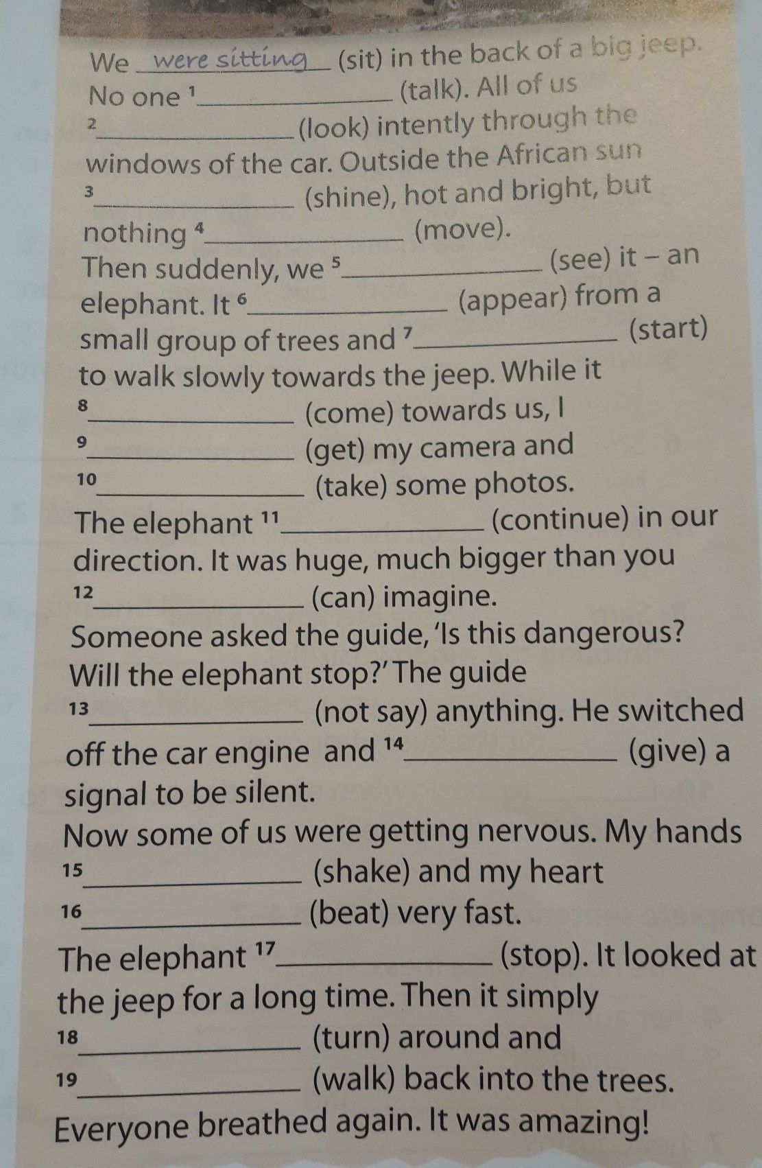 We were sitting in the back of big jeep. No one was talking. All of us were looking intently through the windows of the car. Outside the African sun shone, hot and bright, but nothing moved. Then suddenly, we saw it — an elephant. It appeared from small group of trees and started to walk slowly towards the jeep. While it was coming tomards us, i got my camera and took some photos. The elephant continued in our direction. It was huge, much bigger than you could imagine. Someone asked the guide, 'Is this dangerous? Will the elephant stop?' The guide didn't say anything. He switched off the car engine and gav a signak to be silent. Now some of us were getting nervous. My hands were shaking and my heart were beating wery fast. The elephant stopped. It looked ar the jeep for a long time. Then it simply turned around and walked back into the trees. Everyone Breathered again. It was amazing!