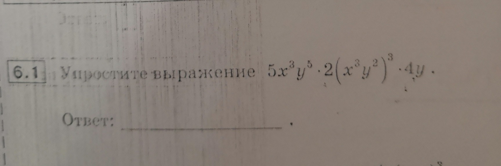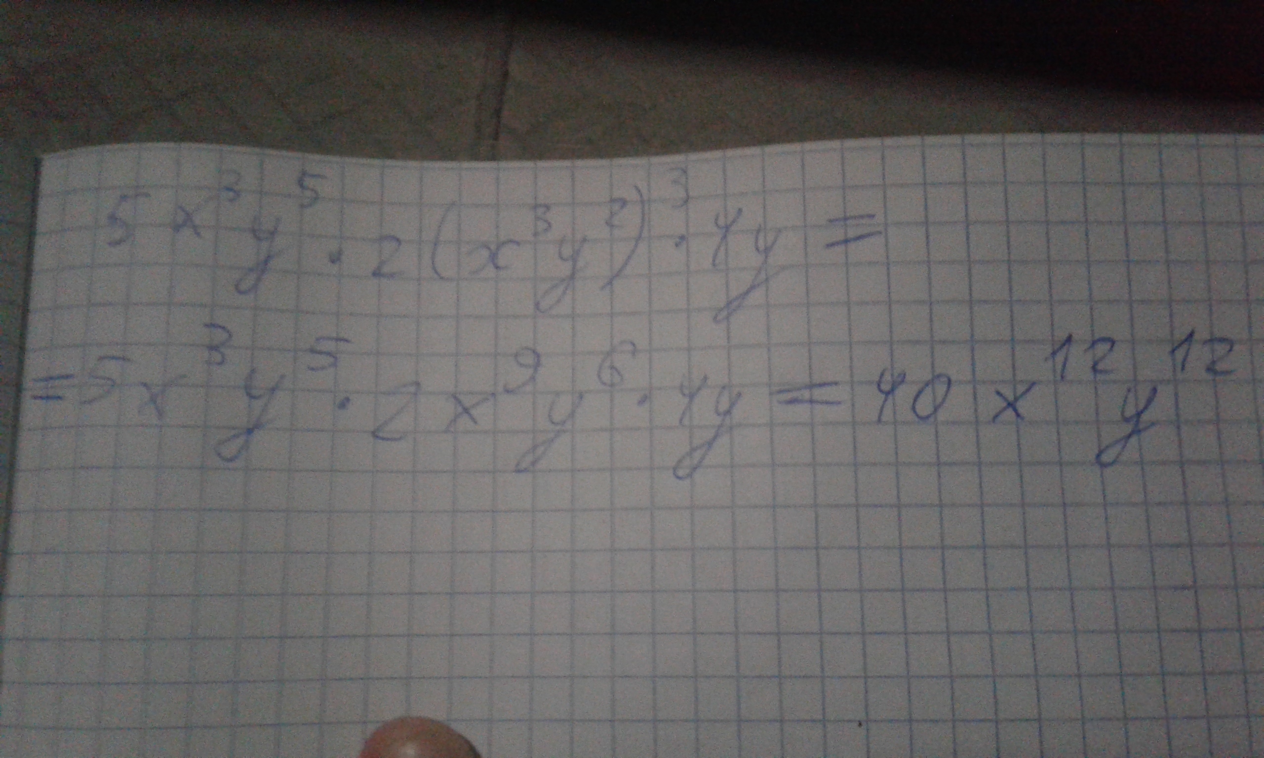 Собственно, вот: сначала решаем то, что в скобках. x(3*3) = x(9), y(2*3) = y(6), умножаем целые числа: 5 * 2 * 4 = 40, складываем все полученные степени: 40 * x(9 + 3) * y(5 + 6 + 1) = 40 * x(12)y(12) Легко и просто :) Прочитайте про свойства степеней, их сложение, умножение и одночлены тоже: понятнее будет.