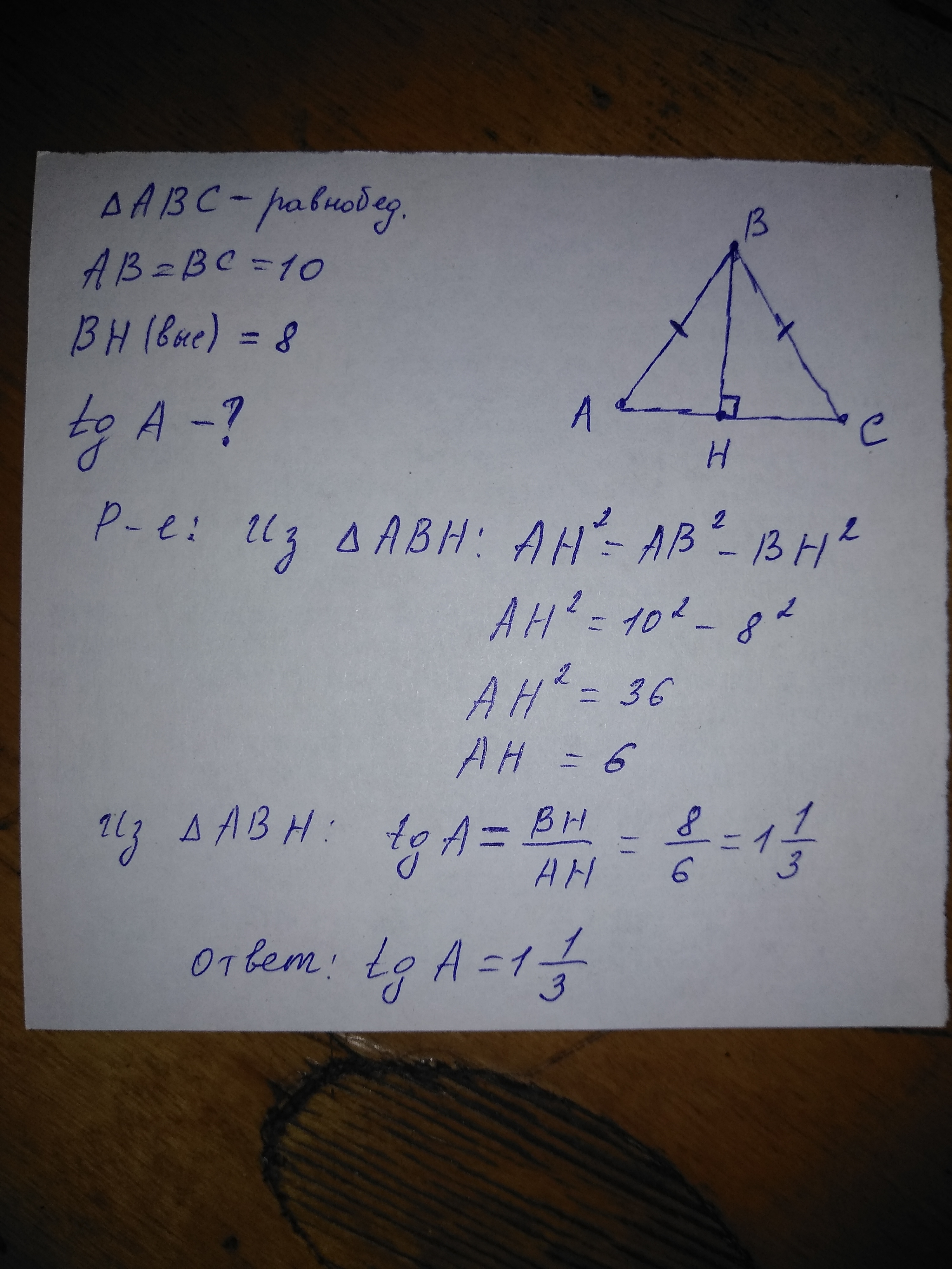в равнобедренном треугольнике АВС боковая сторона АВ равна 10, а высота, проведенная к основанию равна 8. Найти tg A