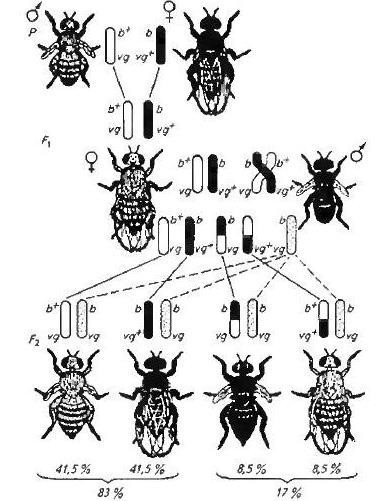 В) Какое расстояние в хромосоме между генами, определяющими форму крыльев и окраску тела дрозофил: