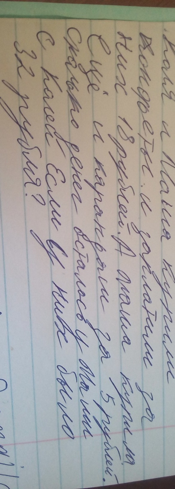 9 рублей. Объясняю: сначала было у них 32 рубля. Купили конфеты за 12 рублей = 32 - 18 = 14