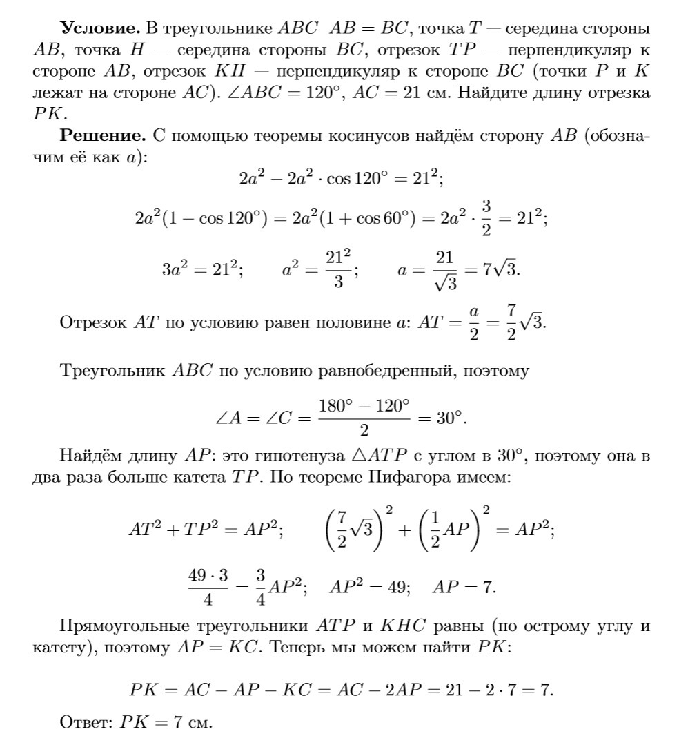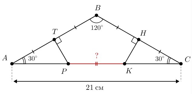 в треугольнике ABC AB=BC, точка Т - середина стороны AB, точка Н-середина стороны ВС, отрезок ТР перпендикуляр к стороне АВ, отрезок КН перпендикуляр к стороне ВС (точки Р и К лежат на стороне АС). УГОЛ АВС =120, АС=21 см. найдите длину отрезка РК.