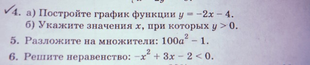 а) Графиком функции у = -2х - 4 является прямая, которая проходит через точки (0; -4) и (-2; 0) (график во вложении)