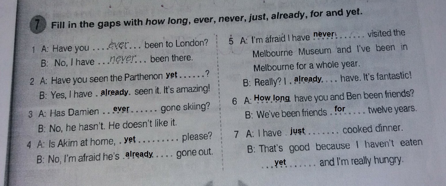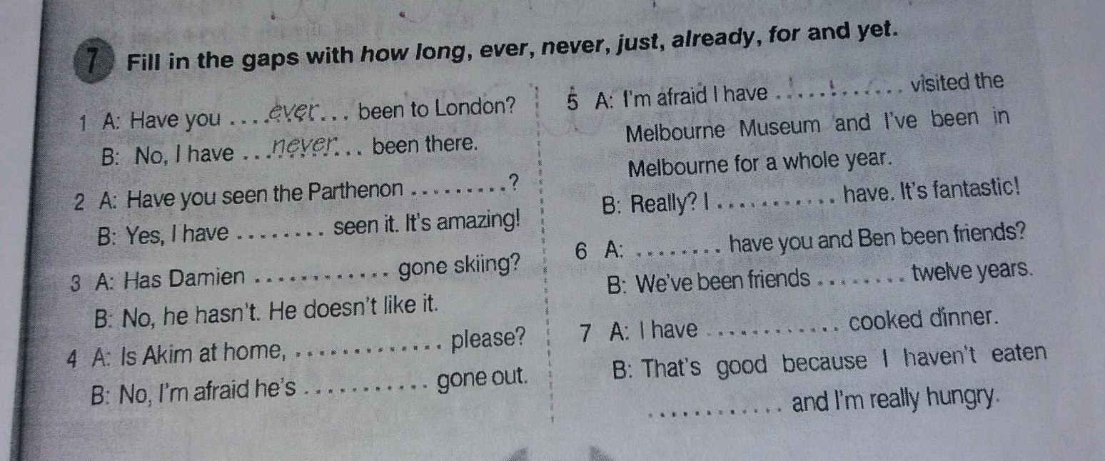 Fill in the gaps with how long, ever , never , just , already , for and yet.