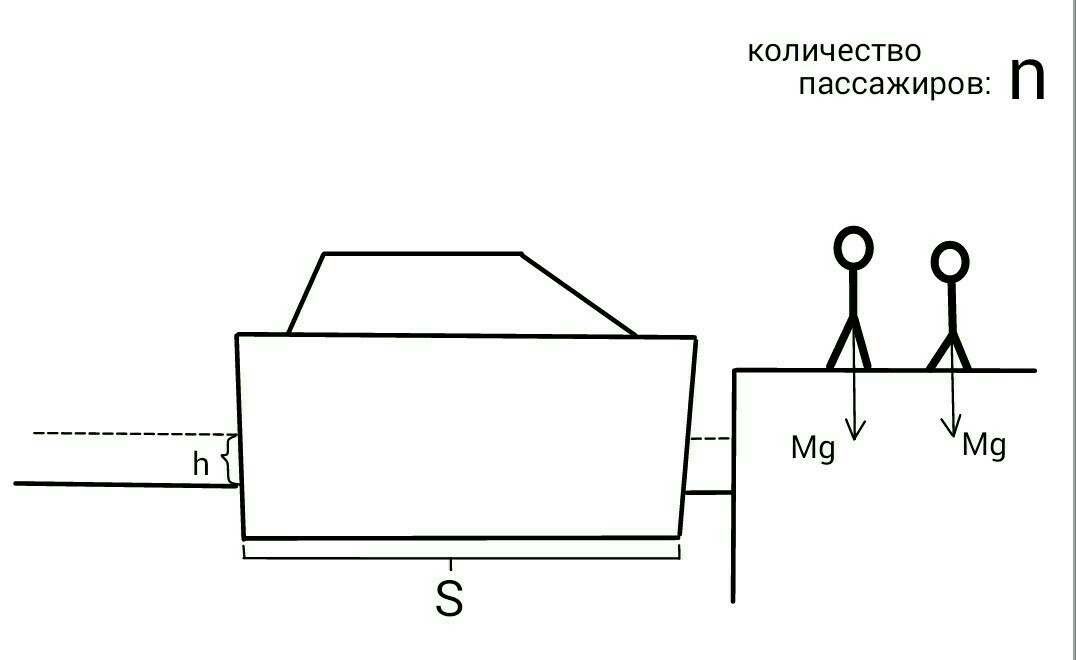 (n - количество пассажиров; М - масса одного пассажира; Рв - плотность воды; S - площадь теплохода; h - расстояние, на которое уменьшилась осадка теплохода)