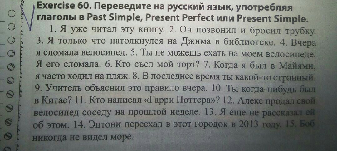 1. I have already read this book. 2. He has called and hung up. 3. I have just bumped into Jim in the library. 4. I broke my bicycle yesterday. 5. You can't ride my bike. I've broken it. 6. Who has eaten my cake? 7. When I was in Miami I often went to the beach. 8. You've been kind of weird lately. 9. The teacher explained this rule yesterday. 10. Have you ever been to China? 11. Who wrote the Harry Potter books? 12. Alex sold his bicycle to his neighbour last week. 13. I haven't told her about it yet. 14. Anthony moved to this town in 2013. 15. Bob has never seen the sea.