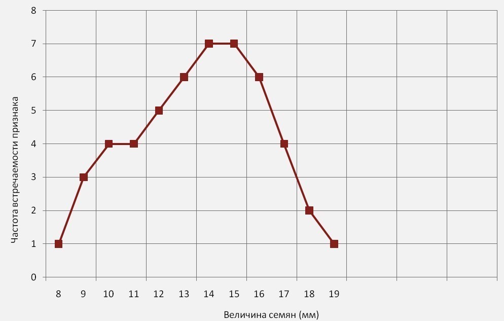 На представленном графике показано распределение семян тыквы по их величине. Изучите внимательно график и дайте ответы на вопросы.