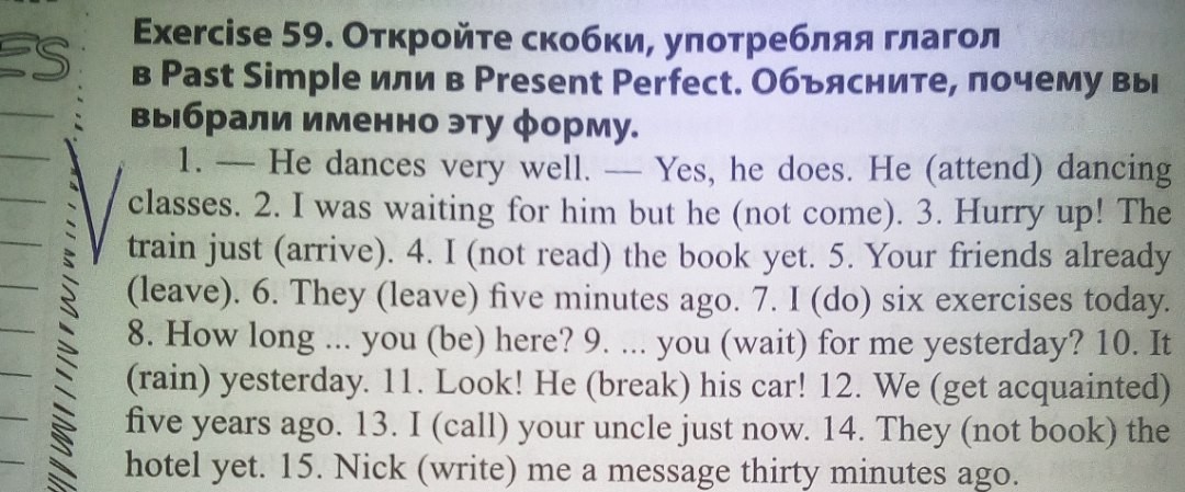 1- Он танцует очень хорошо. Да, это так. Он (attended) посещал уроки танца. 2. Я ждал его но он не пришел (has not come). 3. Поторопись! Поезд только что (уже) приехал(arrived). 4. Я еще не читал книгу (has not). 5. Ваш друг уже ушел (left). 6. Они ушли 5 минут назад (have left). 7. Я сделал сегодня 6 упражнений (have done). 8. Как долго ты тут был (have you been here)? 9. Ты ждал меня вчера (Did..wait)? 10. Вчера шел дождь (rained). 11. Посмотри! Он поломал (разбил) свою машину (has broken). 12. Мы познакомились 5 лет назад (got acquainted). 13. Я звоню твою дяде немедленно (called). 14. Они еще не заказали отель (have not booked). 15. Ник написал мне сообщение 30 минут назад (wrote).