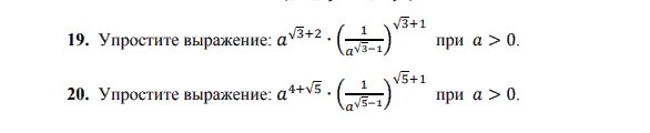 19) :  :  {a}^{ sqrt{3} + 2 }  times  {( frac{1}{ {a}^{ sqrt{3} - 1 } } )}^{ sqrt{3} + 1 }  =  {a}^{ sqrt{3} + 2 }  times  {( {a}^{ - (sqrt{3}  - 1)}) }^{ sqrt{3}  + 1} =   {a}^{ sqrt{3}  + 2}  times  {( {a}^{1 -  sqrt{3} } )}^{ sqrt{3}  + 1}  =  {a}^{ sqrt{3} +  2}  times  {a}^{(1 -  sqrt{3} )(1 +  sqrt{3}) }  =  {a}^{ sqrt{3}  + 2}  times  {a}^{1 - 3}  =  {a}^{ sqrt{3}  + 2}  times  {a}^{ - 2}  =  {a}^{ sqrt{3}  + 2 - 2}  =  {a}^{ sqrt{3} }