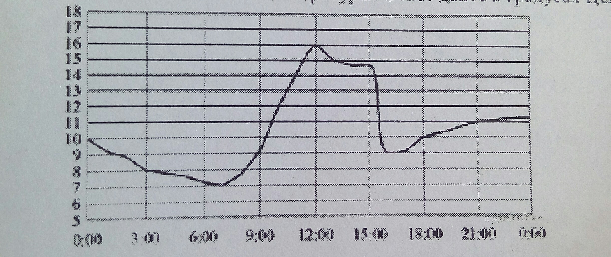 Наибольшая температура: 16 градусов Цельсия в 12:00.