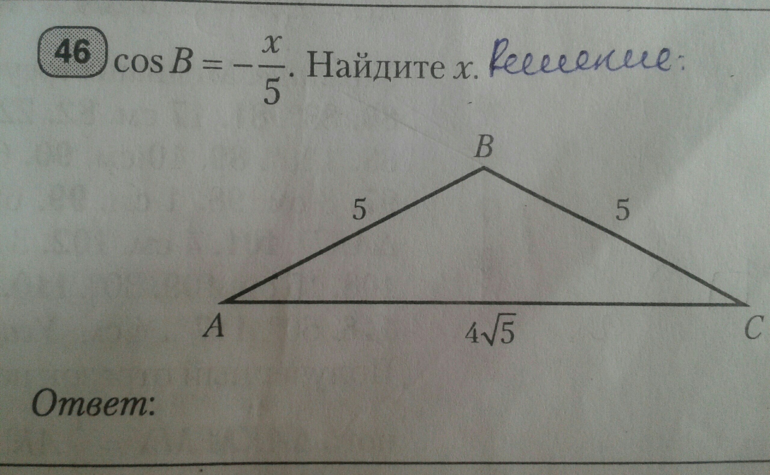 (4*√5)^2 = 5^2 + 5^2 - (2*5*5*(-x/5))