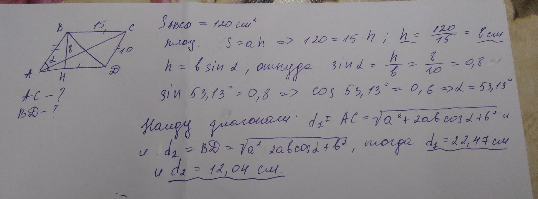 32) Площадь параллелограмма равна 120 см2, а его стороны равны 15 см и 10 см. Найти диагонали параллелограмма.