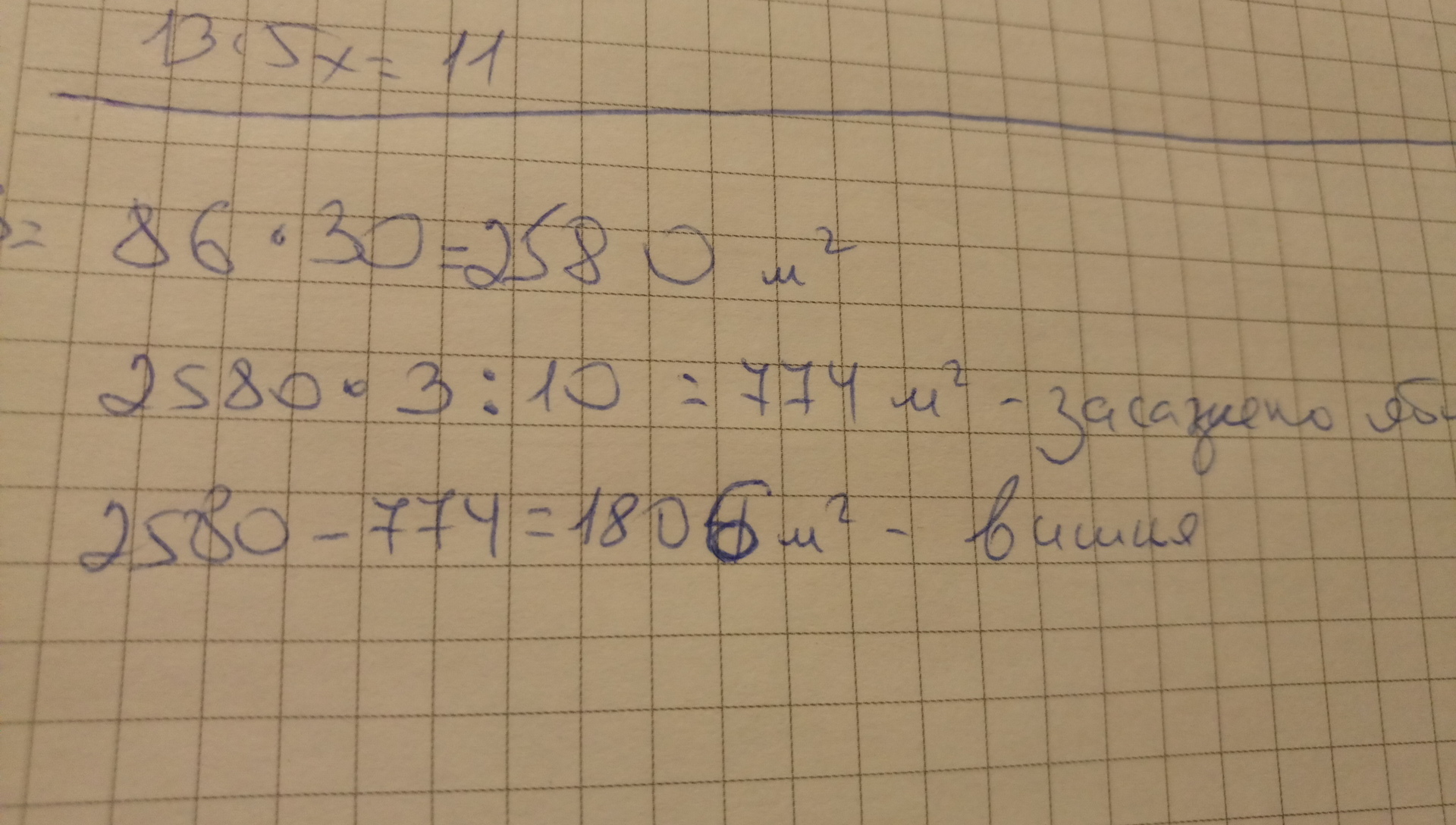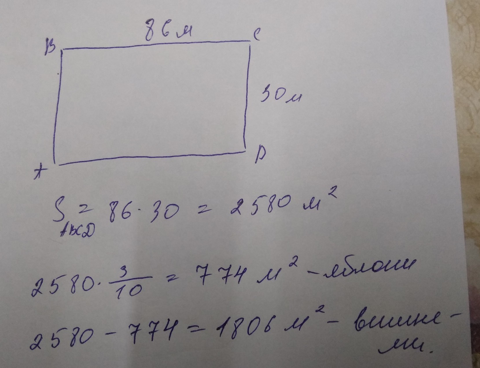 ак решить задачу сад прямоугольной формы имеет длину 86 м и ширину 30 м. 3/10площади сада засажена яблонями,остальная часть площади-вишнями какая площадь засажена вишнями