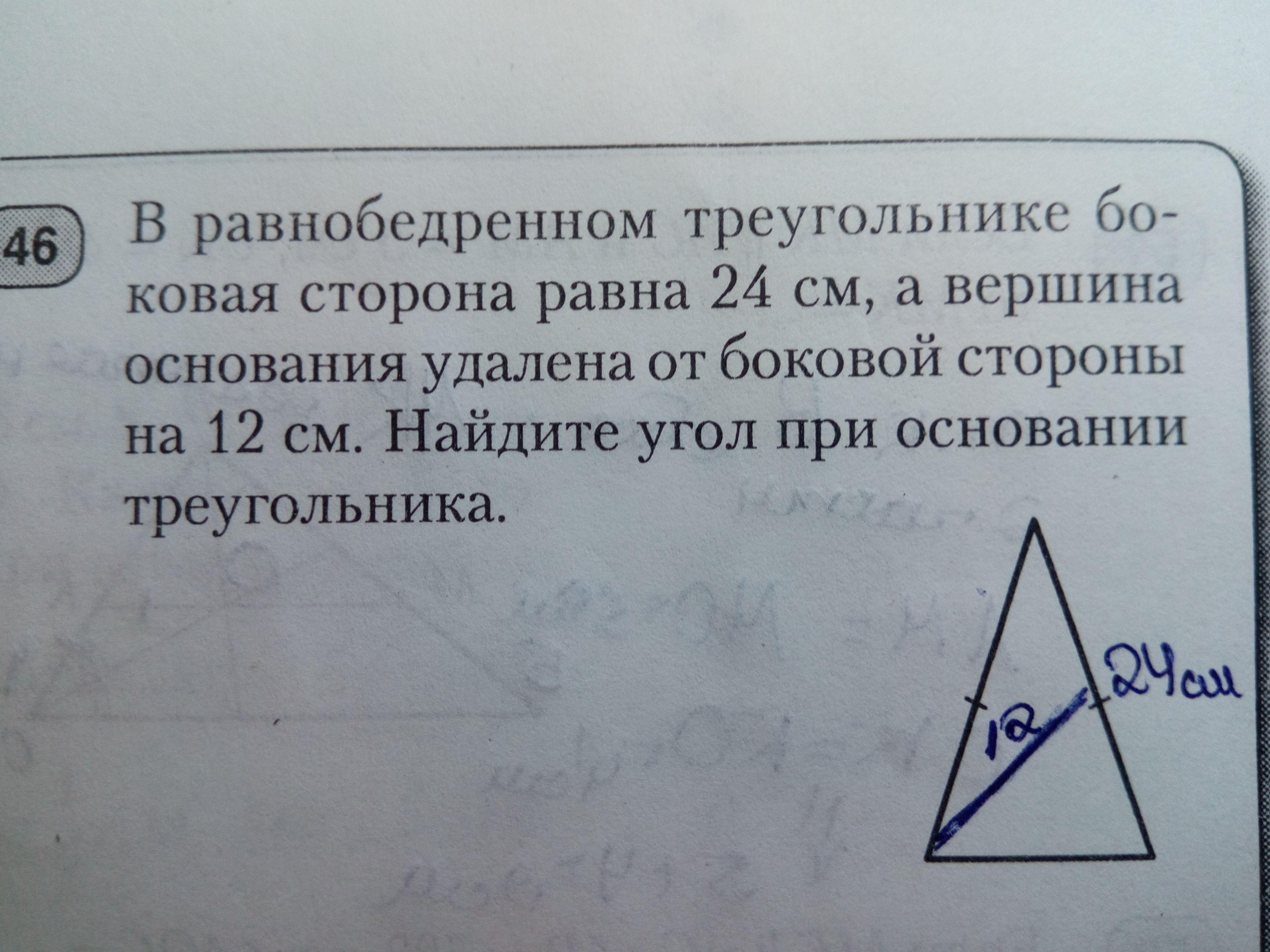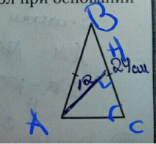Рассмотрим треугольник ABH: угол H = 90°, AH = 12 см; AB = BC = 24 см.