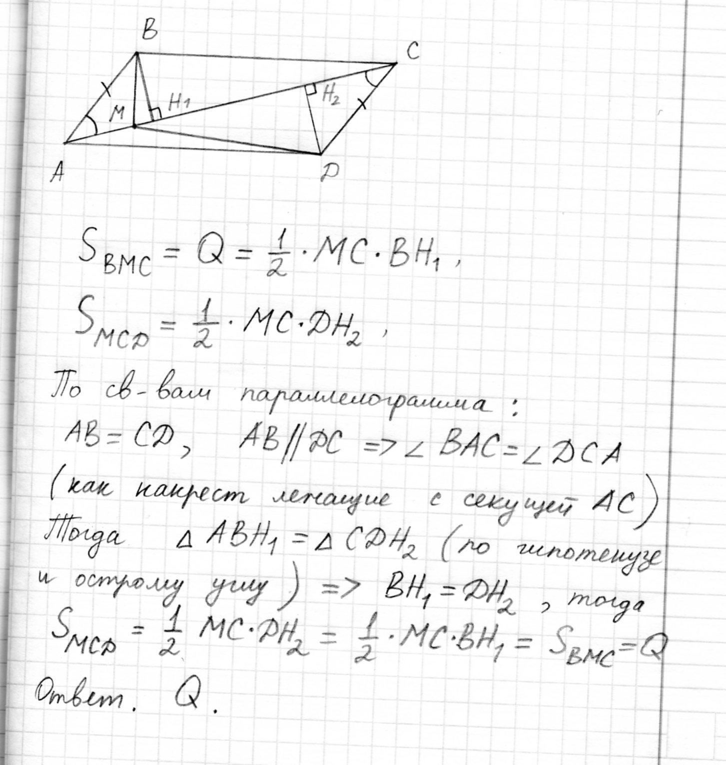 Площадь треугольника BMC=Q. Чему равна площадь треугольника MCD.