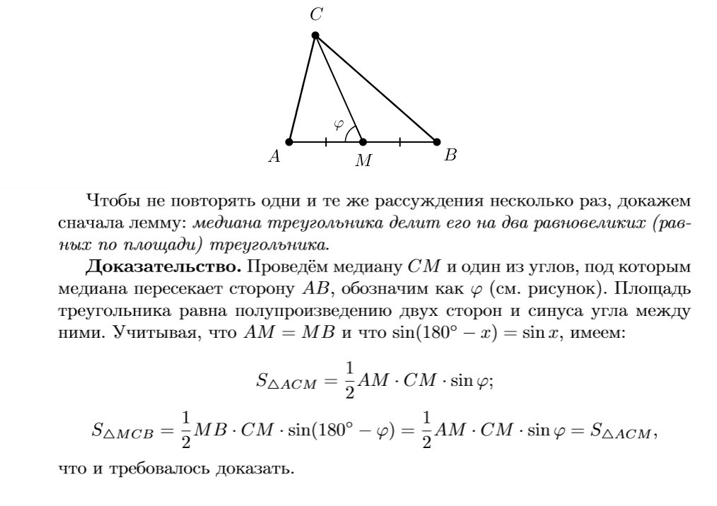 1) Точка M совпадает с точкой O. Тогда из доказанной леммы сразу следует равенство площадей.