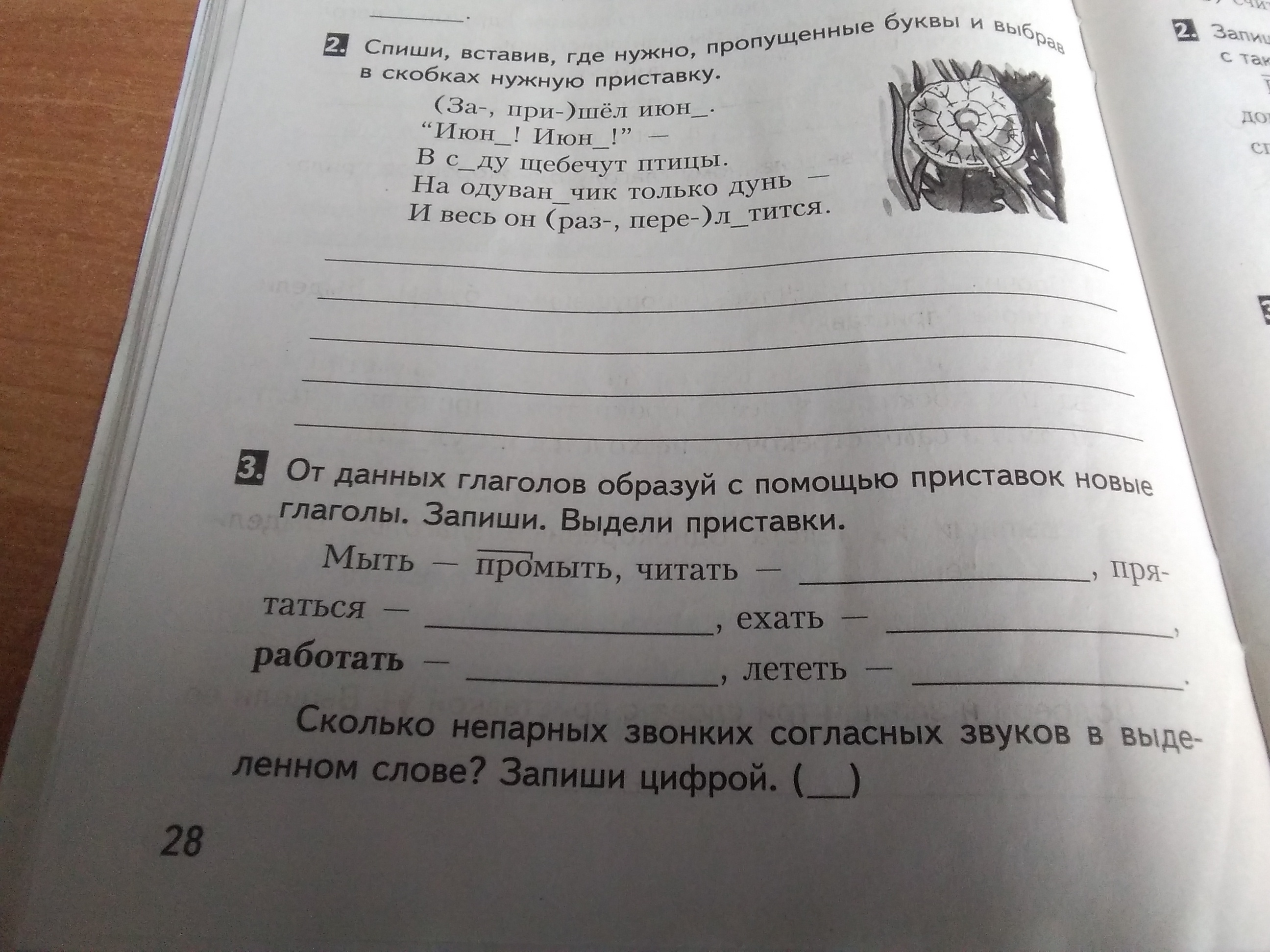 2 пришёл июнь июнь июнь в саду одуванчик разлетится 3 прочитать почитать,перепрятаться ,переехать уехать,поработать ,заработать,перелететь улететь