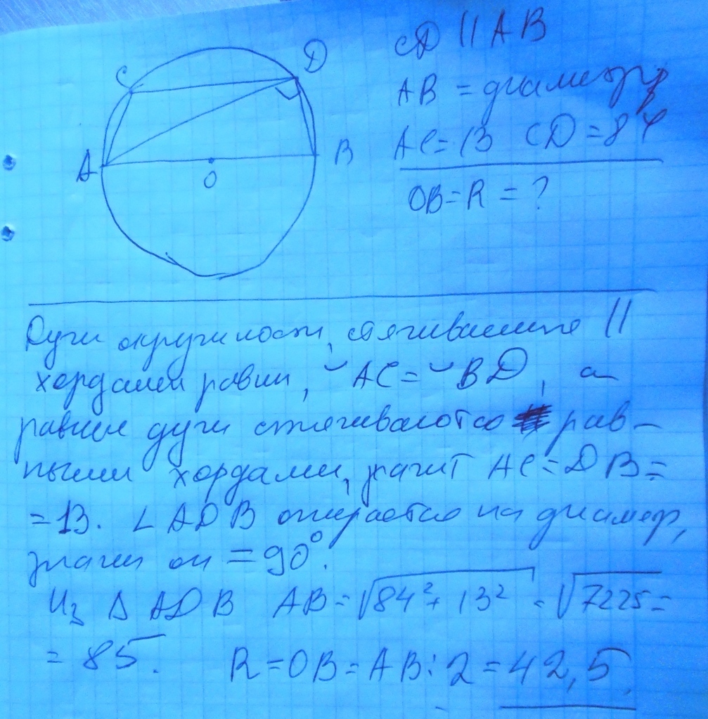 Відстані від одного кінця діаметра до кінців паралельної до нього хорди дорівнюють 13 і 84. Знайти радіс кола.