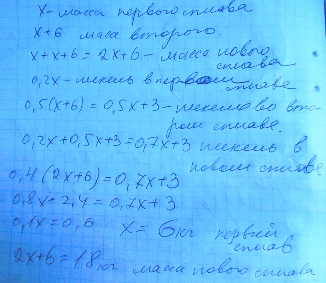 Имеется два сплава. Первый сплав содержит 20% никеля, второй - 50% никеля. Масса второго сплава больше массы первого на 6 кг. Из этих двух сплавов получится третий сплав, содержащий 40% никеля. Найдите массу третьего сплава. Ответ дайте в килограммах.