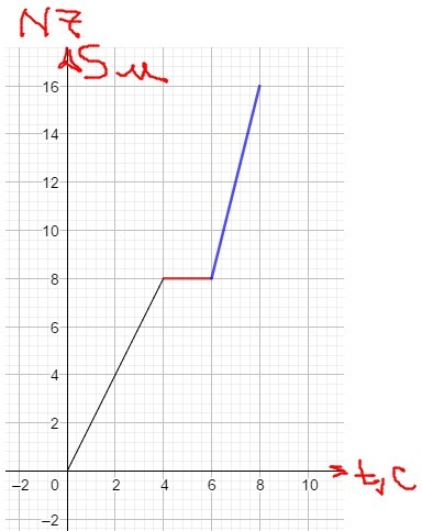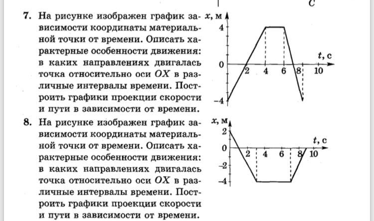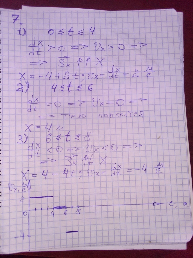 7. На протяжении первых 4с координата тела растёт (тело движется в положительном направлении оси Х) от начального значения -4 м до значения 4 м по линейному закону зависимости координаты тела от времени т.е. равномерно со скоростью vₓ = (4+4)/4=2 м/с и прошло путь s = 4 + 4 = 8 м.. Потом с 4-й по 6-ю секунды координата тела не изменяется т.е. тело не движется, его скорость vₓ = 0 м/с. С 6-й по 8-ю секунды координата тела уменьшается т.е. тело движется в отрицательном направлении оси Х равномерно со скоростью vₓ = (-4-4)/2 = -4 м/с и прошло путь s = 4 + 4 = 8 м.. (график во вложении)