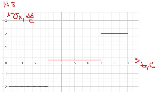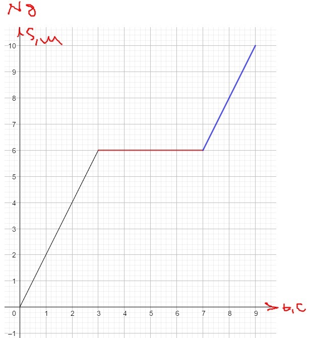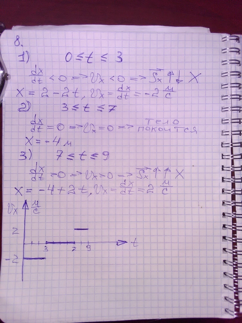 8. На протяжении первых 3с координата тела убывает (тело движется в отрицательном направлении оси Х) от начального значения 2 м до значения -4 м по линейному закону зависимости координаты тела от времени т.е. равномерно со скоростью vₓ = (-4-2)/3=-2 м/с и прошло путь s = 2 + 4 = 6 м.. Потом с 3-й по 7-ю секунды координата тела не изменяется т.е. тело не двигается, его скорость vₓ = 0 м/с. С 7-й по 9-ю секунды координата тела растёт т.е. тело движется в положительном направлении относительно оси Х равномерно со скоростью vₓ = (0+4)/2 = 2 м/с и прошло путь s = 4 м.. (график во вложении)