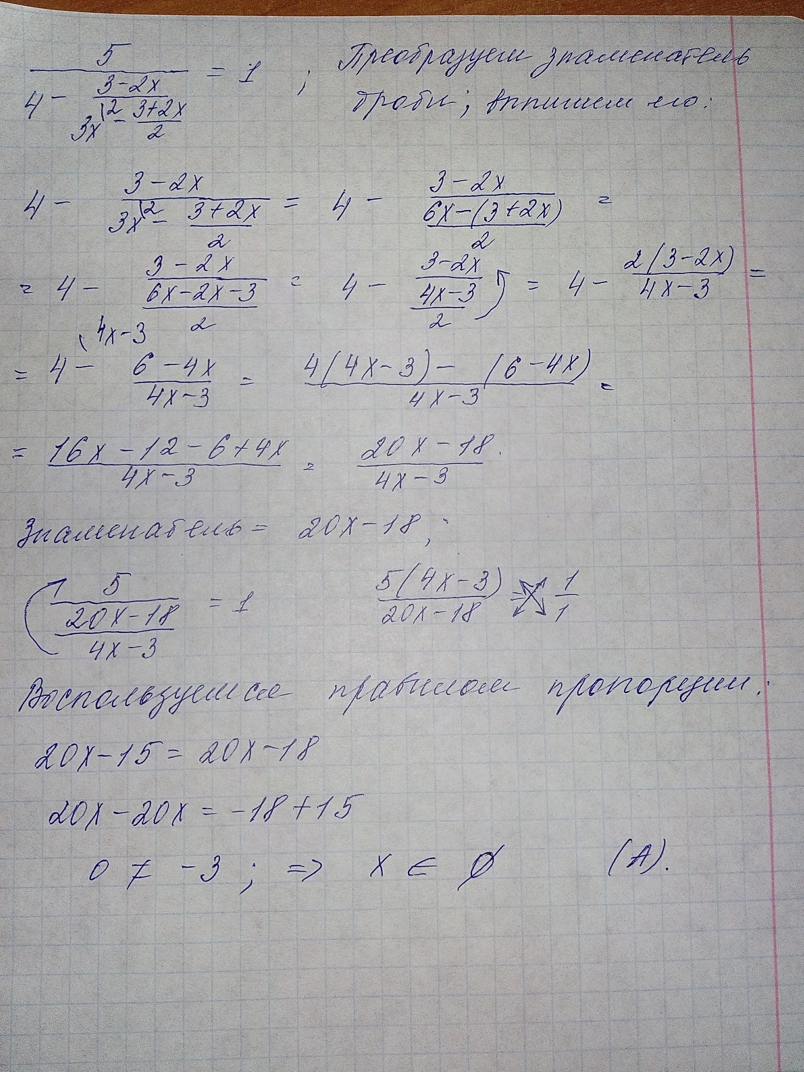 В строчке "знаменатель" забыл дописать 20x-18/4x-3 ,но смысл далее сохраняется