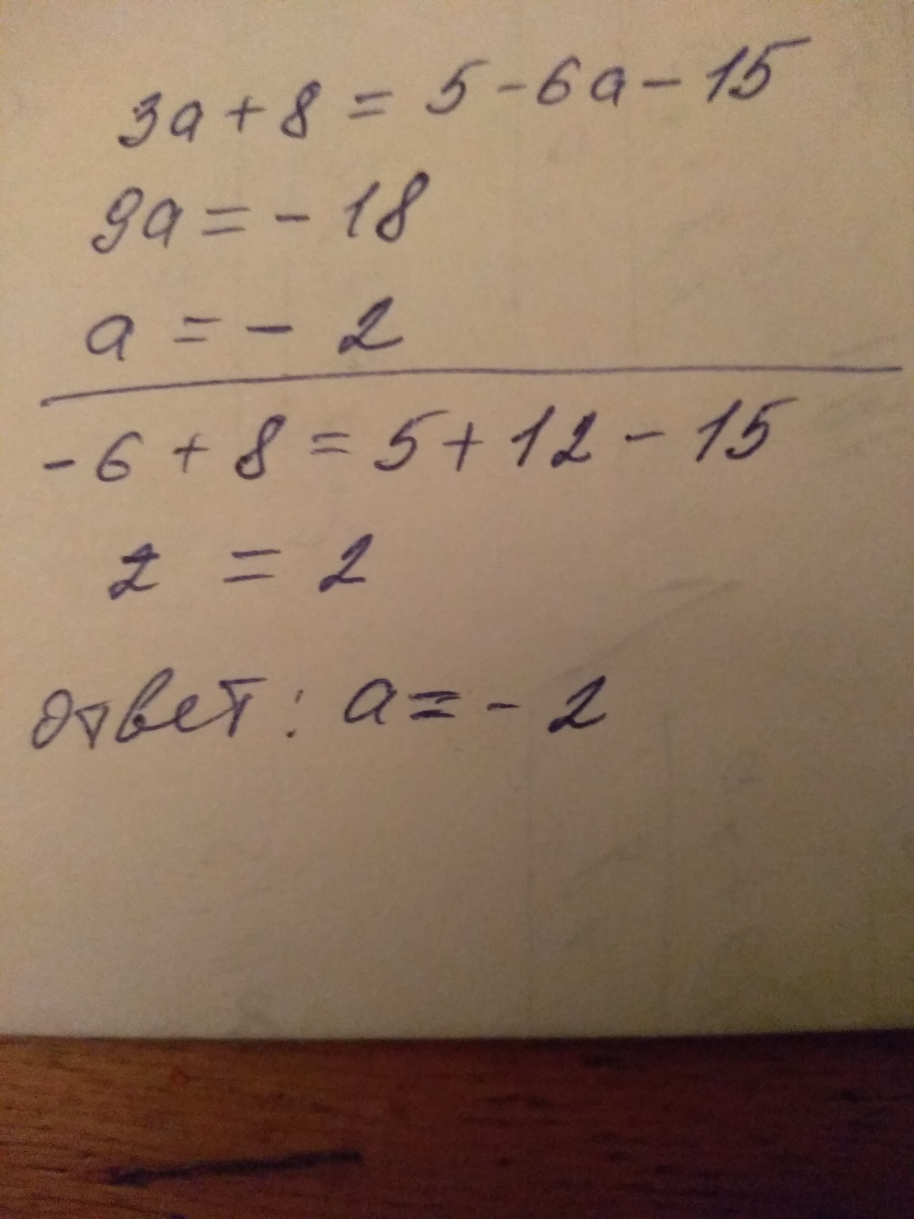 При каком значении переменной a значение выражение 3a + 8 меньше значения выражения 5-6 a на 15.
