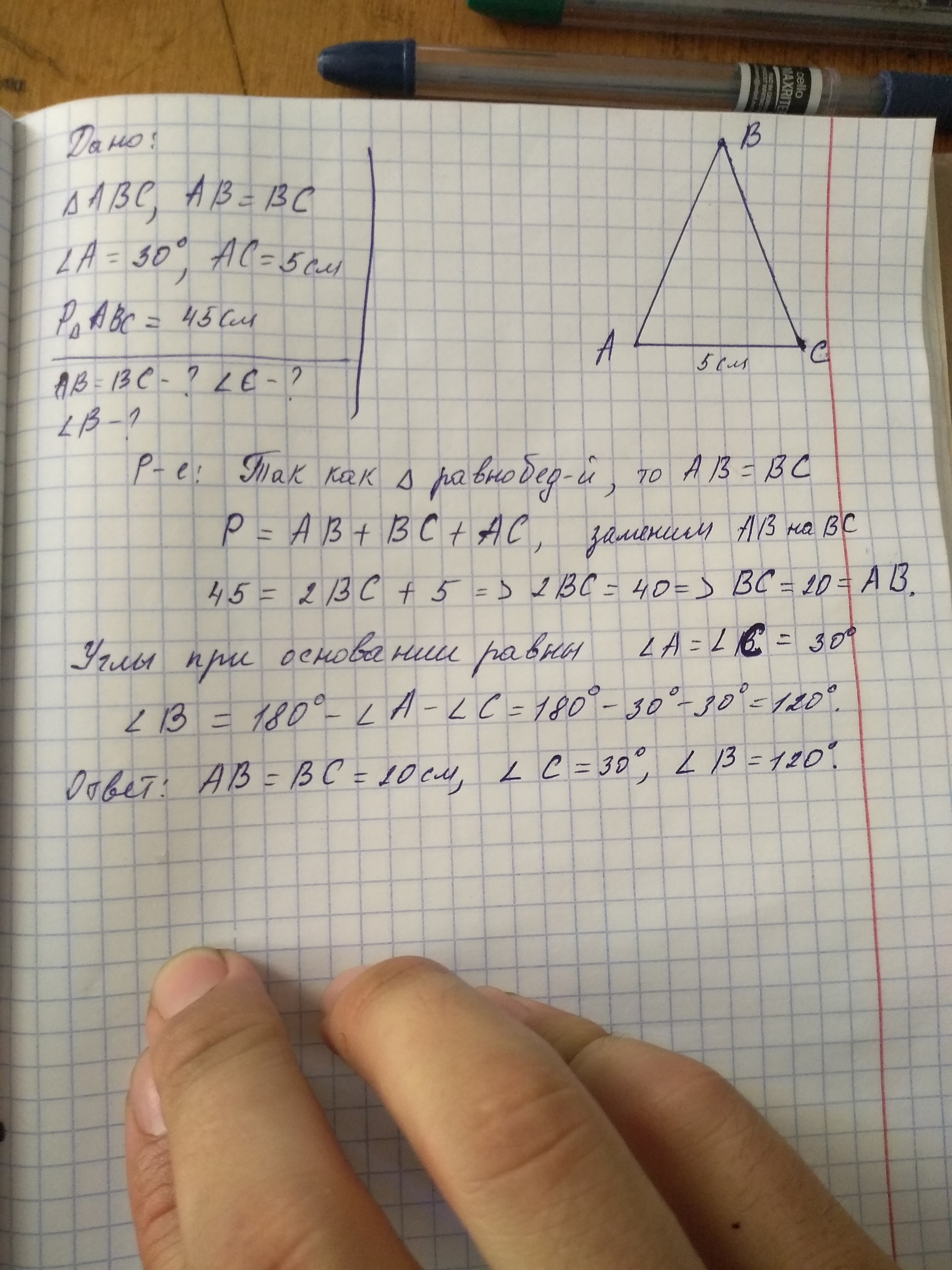 Тогда угол B = 180° - 2*30° = 180° - 60° = 120°