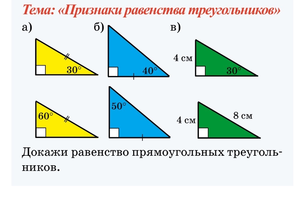 Если катеты одного треугольника соответственно равны катетам другого треугольника, то такие прямоугольные треугольники равны.
