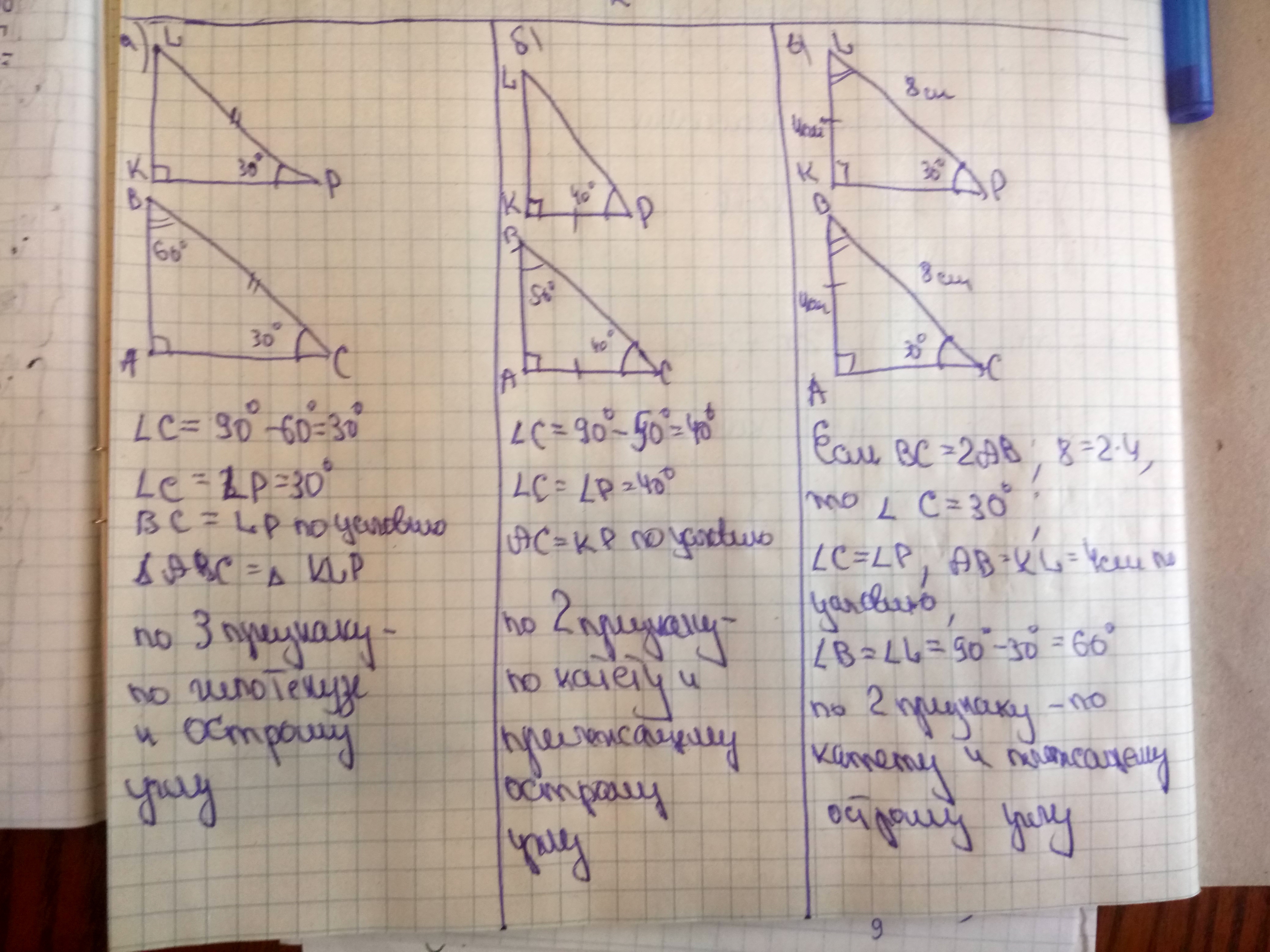 б). Треугольники равны по равным катетам и углам.