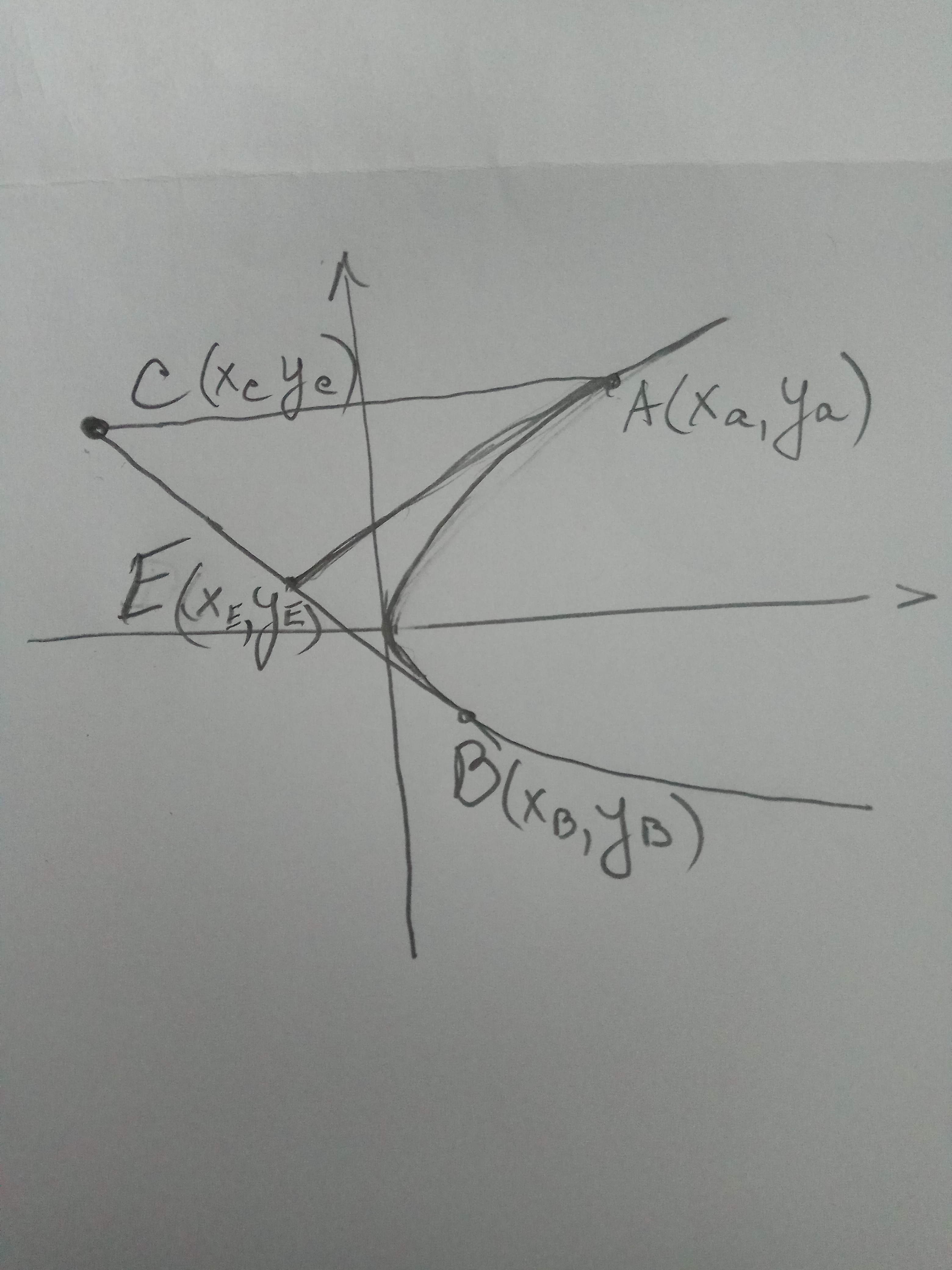 Дано уравнение параболы У² =2Х.Прямая ,касательная к параболе в точке А пересекается в точке Е(Хе,Уе) с прямой, касательной к параболе в точке В. А - в первой,а В(Хв,Ув)- в 4 четверти.Через точку А(Ха,Уа) провели прямую,которая пересекает прямую ВЕ в точке С(Хс,Ус) так,что СЕ=ЕВ. 1) покажи,что Уе(Уа-Ув)=Ха-Хв 2) покажи,что СА параллельна оси Х.