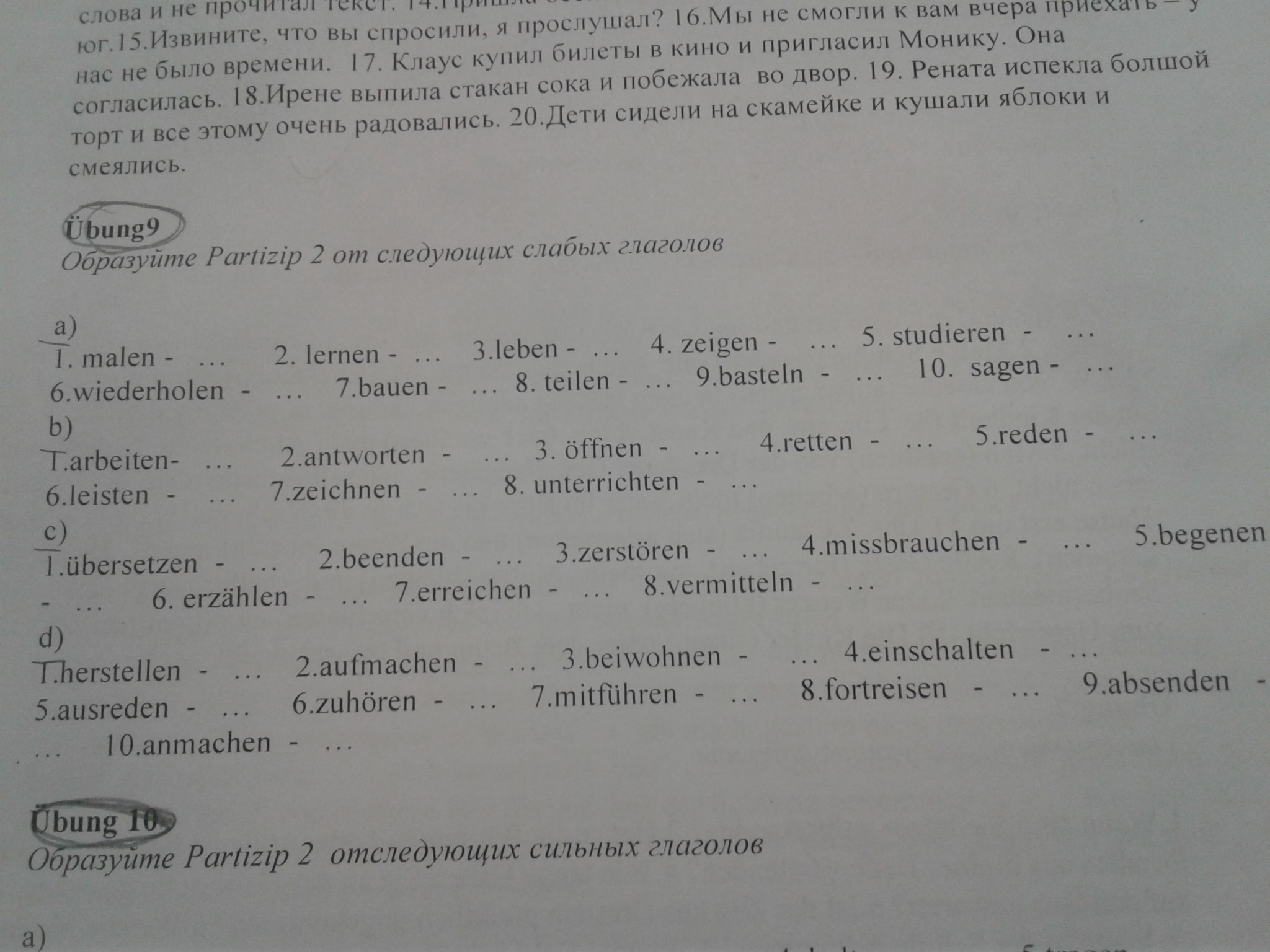 а) hat gemalt, hat gelernt, hat gelebt, hat gezeigt, hat studiert, hat wiederholt, hat gebaut, hat geteilt, hat gebastelt, hat gesagt