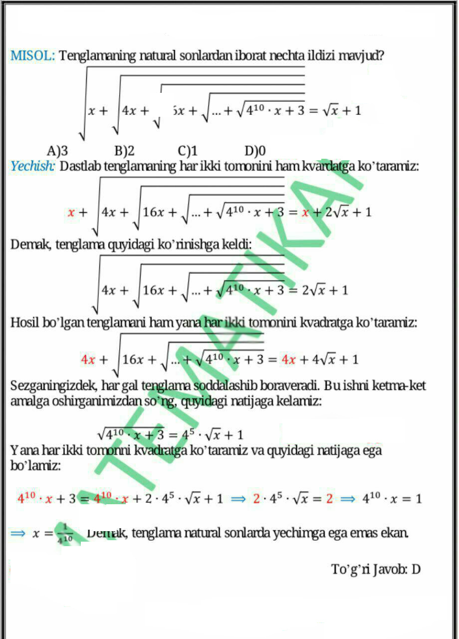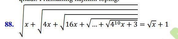 Надо возвести в квадрат оба стороны уравнения. Я сделал это все и решил на фото, но на узбекском языке! Прощу извинения от администраторов! Но всё указано последовательно! Ответ 1/4х^10. Так как это число не натуральное, то ответ при никаких!