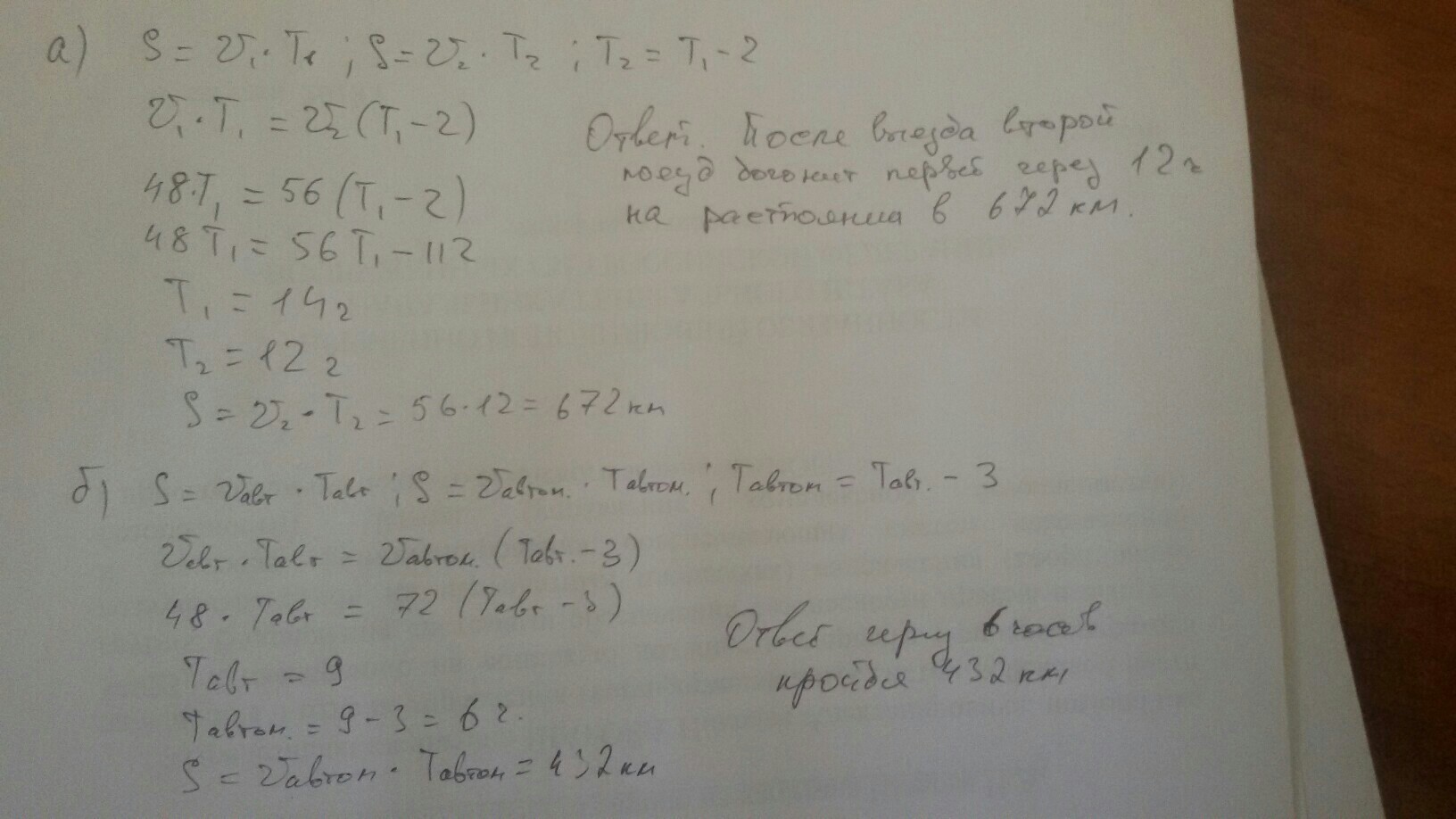 а)Из станции вышел поезд который проходит 48 км за час.Через 2 часа вышел второй поезд в том же направлении 56 км в час.Через сколько часов после выезда поезда и на каком расстоянии второй поезд догонит первый.