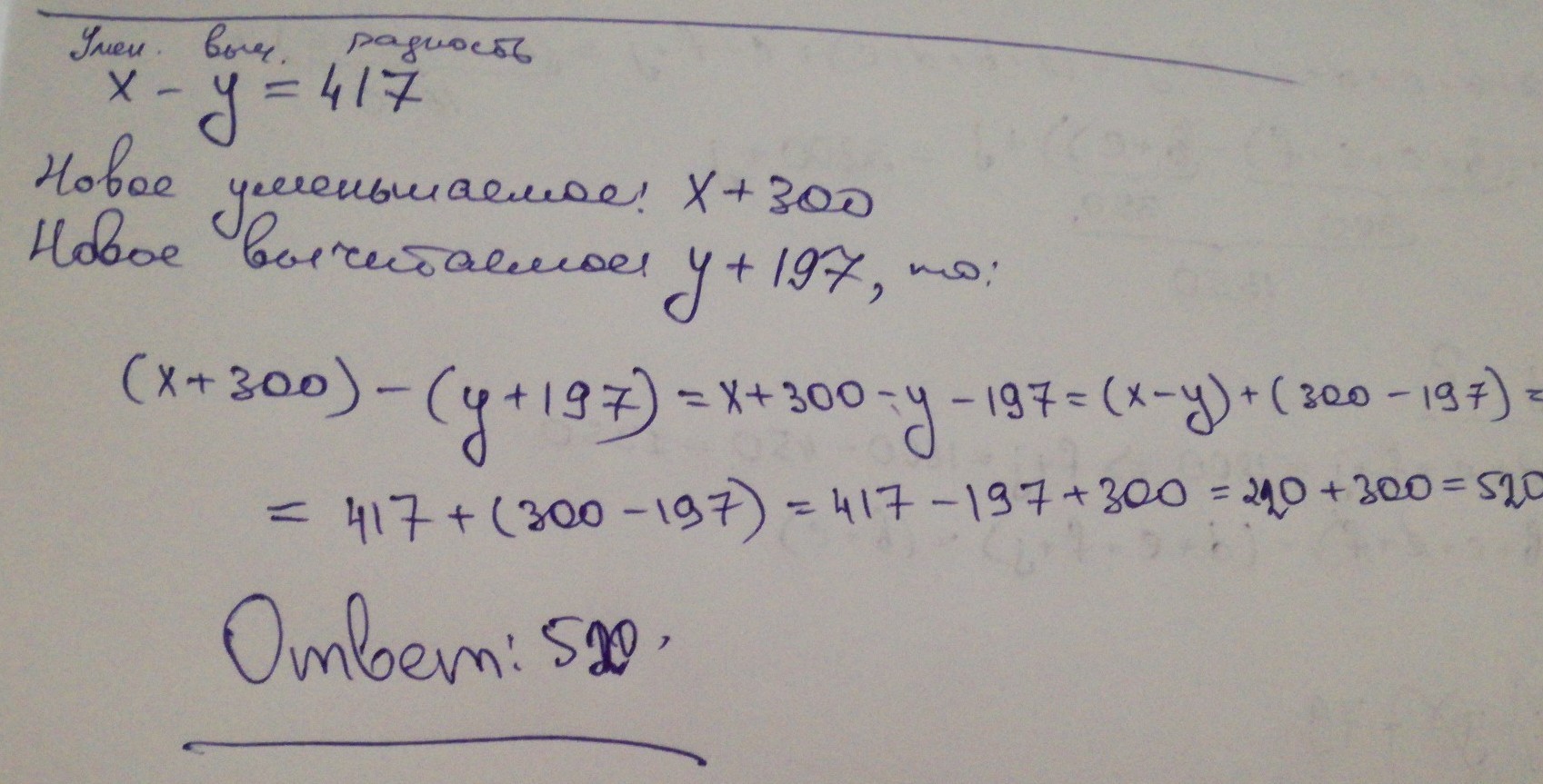 Разность двух чисел равна 417 если к уменьшаемому добавить 300 а к вычитаемому 197 то чему будеть равна новая разность 3 класс